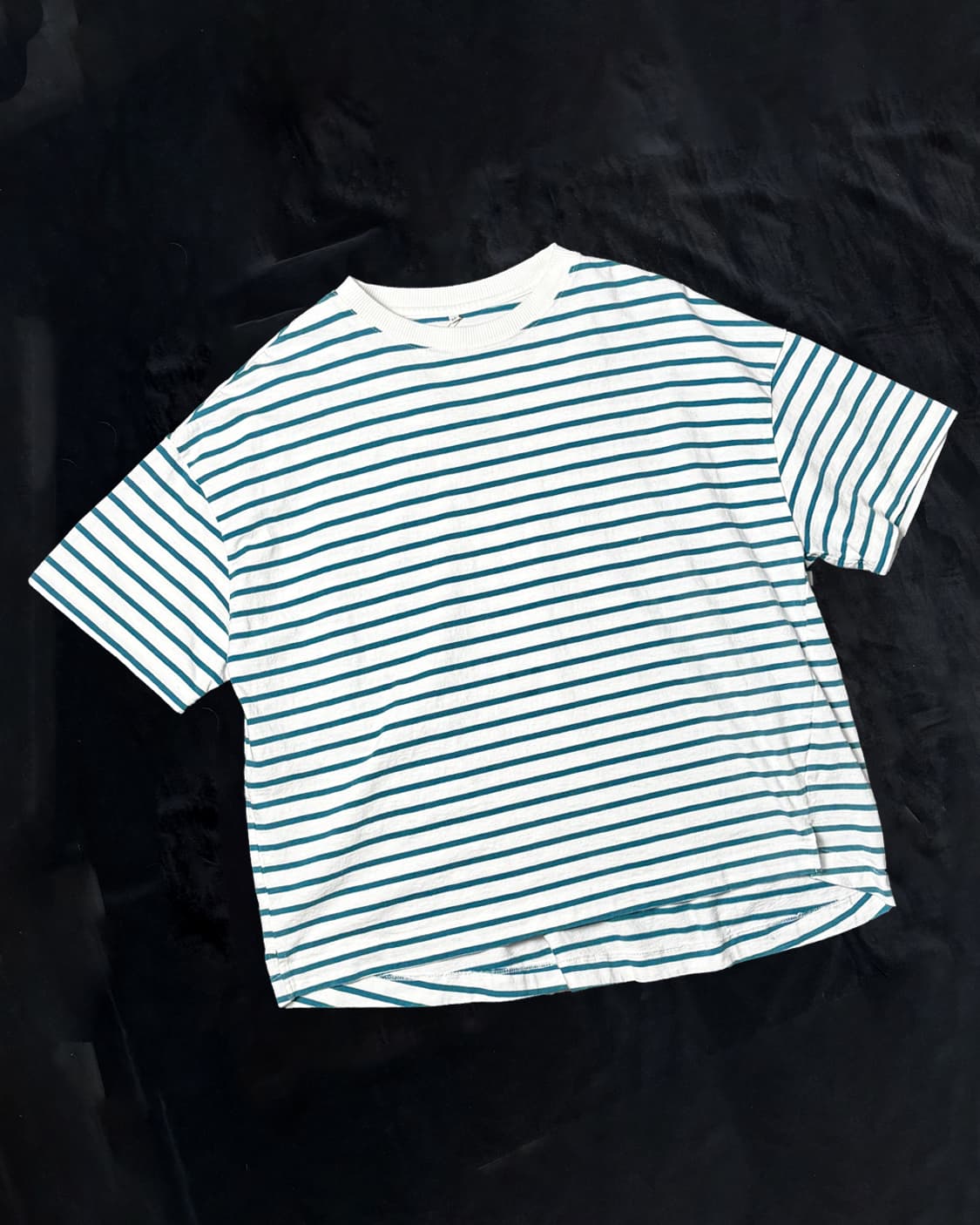 클래식한 스트라이프 티셔츠 입니다 - 채도가 낮은 민트 컬러에 가까운 스트라이프 - 원단 퀄리티 좋음 - 넥 시보리 퀄리티 좋음 - 밑단 사이드에 절개 포인트 상세 촬영 : 아이폰 15 & 주광색(흰색) 조명 (cm) 총장 65 어깨 60 가슴 59 소매 18