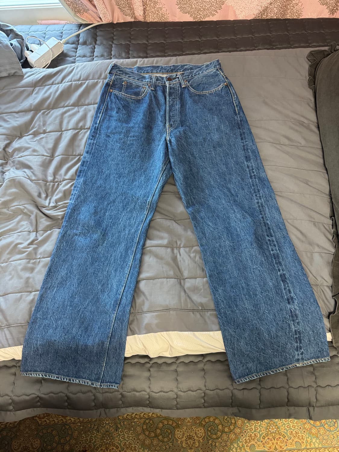 풀카운트(Fullcount) x The Decorum 콜라보레이션 • 원단: 13.7oz 셀비지 데님 (100% 짐바브웨 코튼) • 핏: 하이라이즈 와이드 스트레이트 (0107 남성 버전) • 상태: 1회 착용 (극미중고) • 수선 내역: 체인스티치 기장 수선 및 밑단 워싱(아타리)수선 완료 • 실측 총장: 108cm 여성용 0107의 높은 밑위와 유려한 스트레이트 실루엣을 남성용으로 재해석한 모델입니다. 하이라이즈라 셔츠나 티셔츠를 넣어 입었을 때 테일러드 팬츠 같은 클래식한 무드가 연출됩니다. 원가에 수선비까지 하면 훨씬 비싼 제품이지만, 깔끔하게 10만원 정도 낮춰서 내놓습니다. 1회 착용 후 보관 중인 신품급 상태입니다.