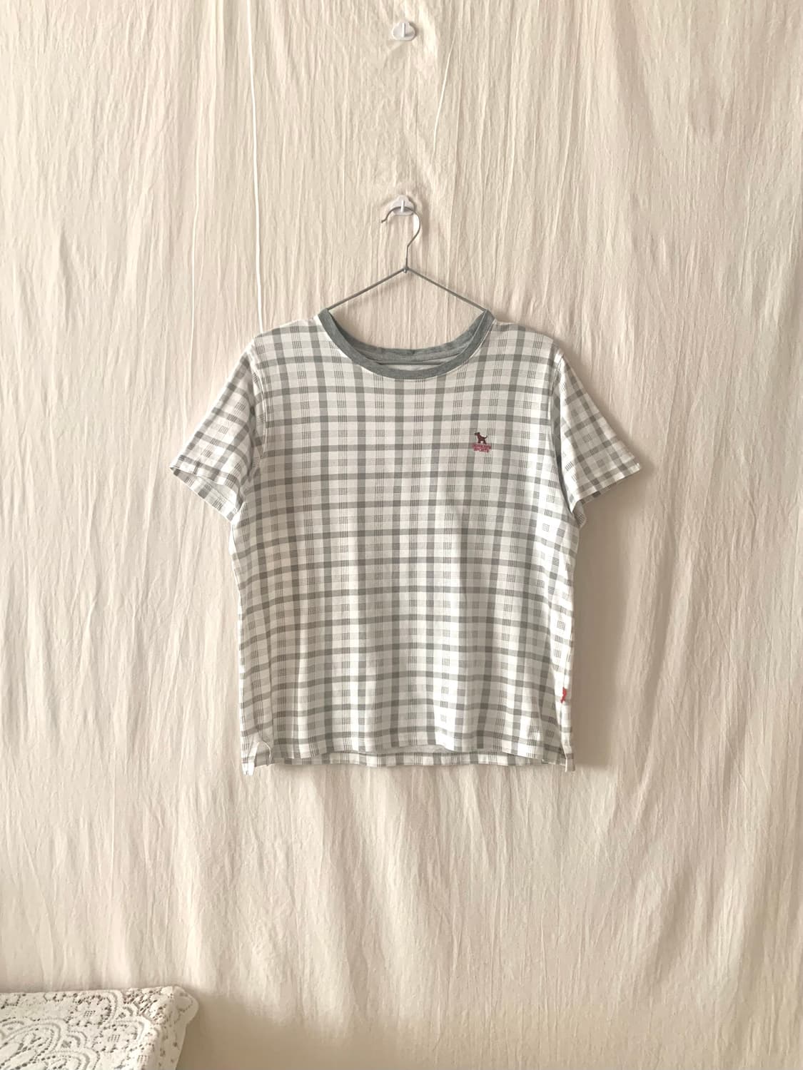 ♫彡。.:・¤゚♫彡。.:・¤゚♫彡。.:・¤゚♫彡。.:・*゚ 연그레이 색감의 체크 반팔입니다.ᐟ 후들후들 얇은 면이라 착용감 좋구요 가슴에 강아지 패치가 아주 귀엽답니다 ⇢ 가슴단면: 51-63 총장: 58 ⇢ 가격: 2.0 모델 사이즈 → 157/54, 하의 27(m)