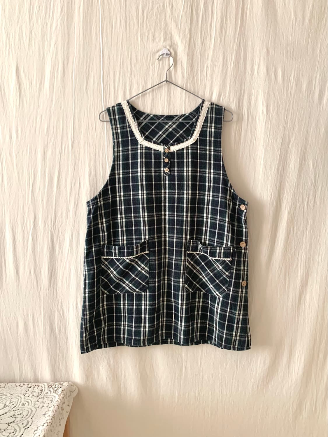 ♫彡。.:・¤゚♫彡。.:・¤゚♫彡。.:・¤゚♫彡。.:・*゚ 그린 색감의 체크 레이스 에이프런 원피스 입니다.ᐟ 나무 단추들이 모리스러운 무드를 주는 친구랍니다♡ ⇢ 가슴단면: 56 총장: 75 ⇢ 가격: 3.0 모델 사이즈 → 157/54, 하의 27(m)