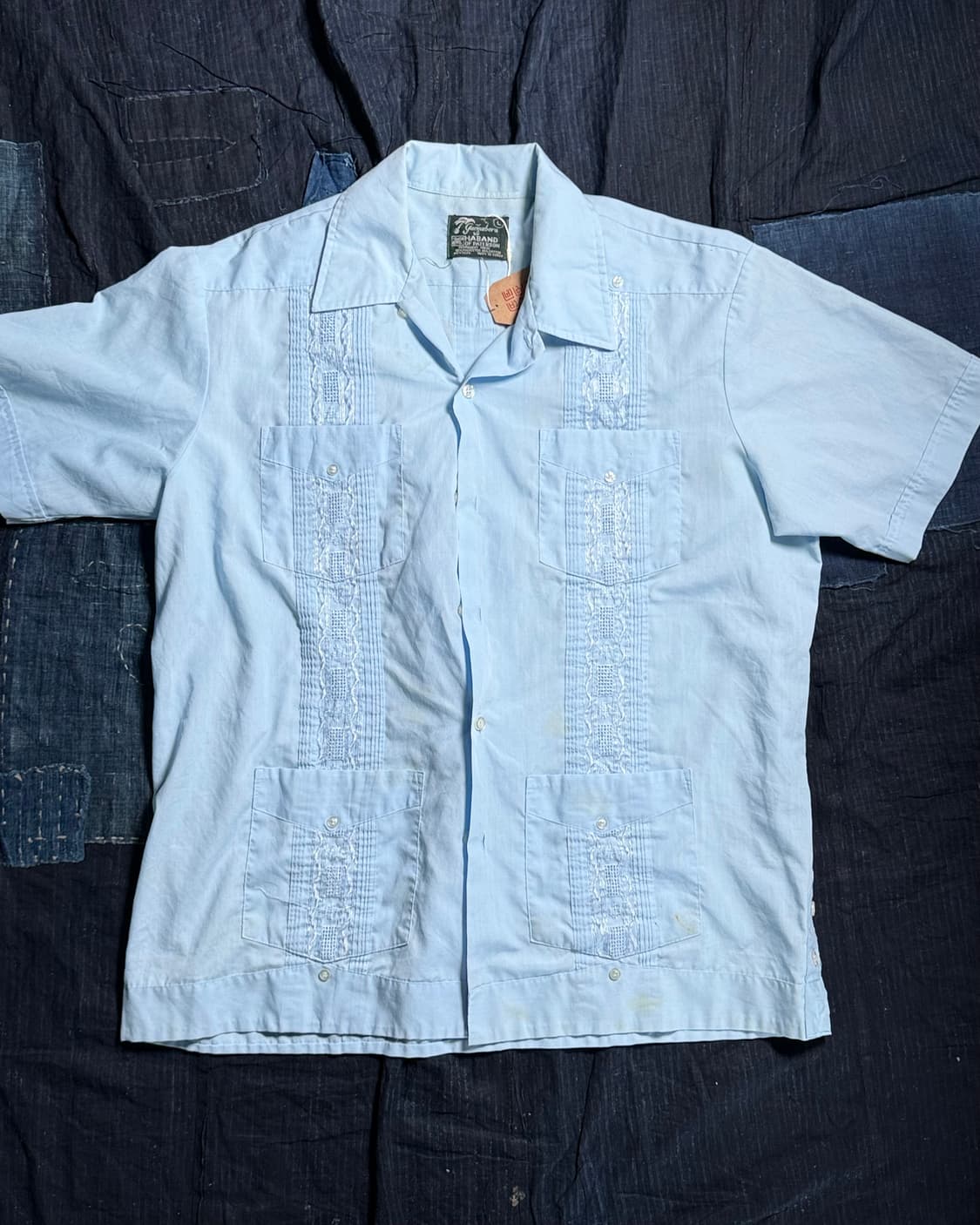 70-80's Revgo 햇빛이 강한 쿠바에서 구아바를 재배할 때 착용했던 셔츠로도 유명하며, 소설가 헤밍웨이가 즐겨입었던 셔츠로 잘 알려진 쿠바셔츠라고도 불리우는 구아야베라 셔츠입니다. 구아바를 담기위한 넓직한 사이즈의 포켓이 전면에 위치해있으며 세로로 길어 뻗은 레이스 등의 장식들이 셔츠를 대표하는 아이코닉한 포인트라 할 수 있습니다. 세월에 따른 약간의 사용감이 존재합니다. • 실측사이즈(cm) : 총장 78 어깨 52 가슴 64 소매 26 • 컨디션 : 7.5/10 • 사이즈 : 남성사이즈 103-105 입으시는 분들에게 권장해드립니다. • 사이즈는 측정방법에 따라 1-2cm의 차이가 있을 수 있습니다. • 빈티지 특성 상 교환/환불이 어렵습니다. 신중한 구매 부탁드리겠습니다. • 배송료 - 3000원 산간/제주지역 5000원 7만원이상 구매 시 배송료 무료!!