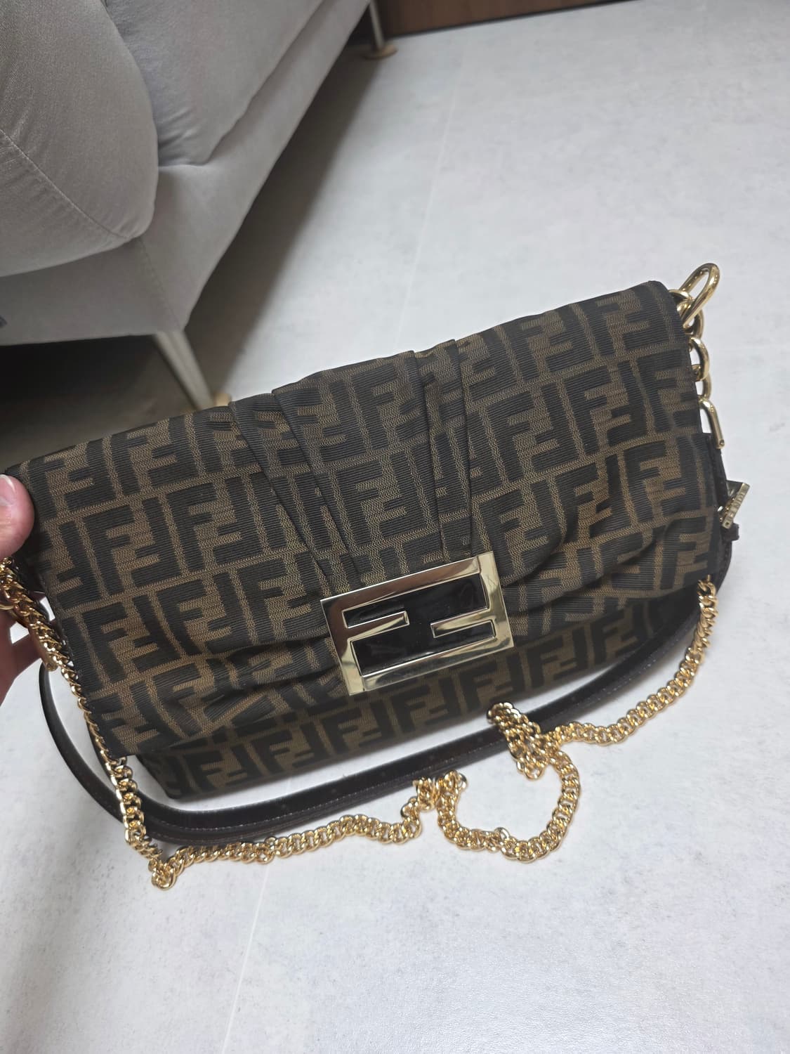 펜디 바게트백입니다 이너백제작해서 각잡혀요 그리고 수납도 꽤 됩니다. 패브릭 소재라 사용감은 있어요 중고 명품에서 구매했어요 체인크로스줄있어요 .자체 크로스백가능