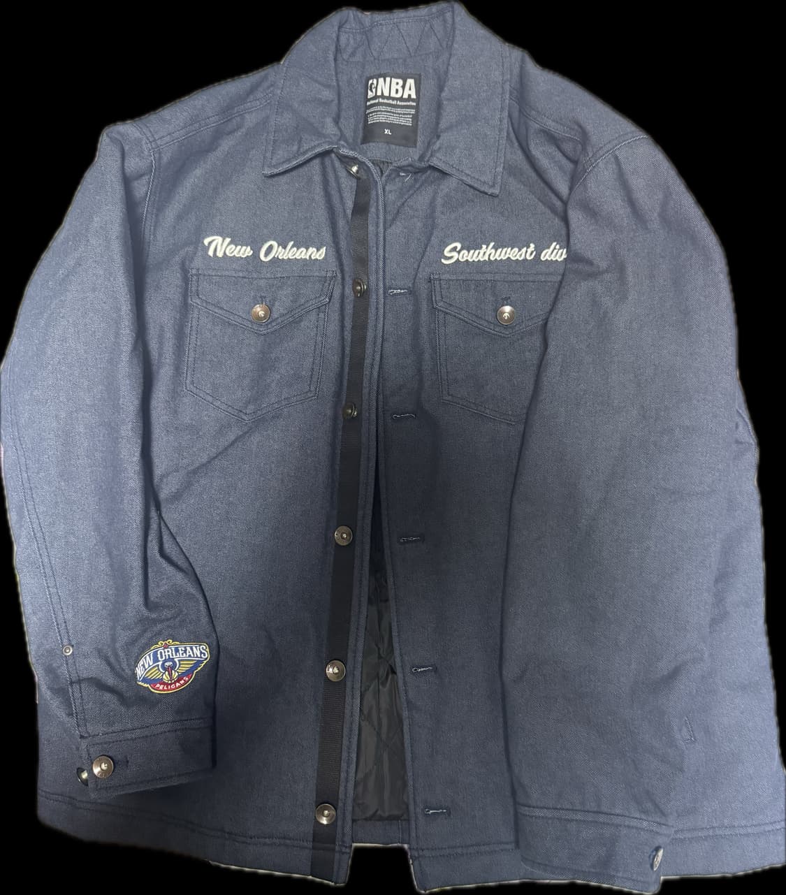 NBA 뉴올리언스 팀의 데님 자켓이에요 앞면에는 뉴올리언스와 Southwest div. 자수가 새겨져 있고 왼쪽 팔에는 뉴올리언스 패치가 포인트로 들어가 있어요 깔끔한 디자인으로 어디에나 매치하기 좋아요
