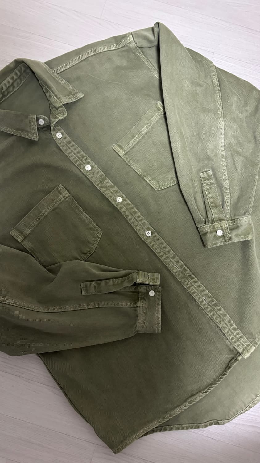 탄탄한 재질의 카키색 워크셔츠입니다. 사이즈는 110 정도 됩니다. 사용감 아예 없습니다 예전에 선물받은건데 택만 떼고 그대로 있어요