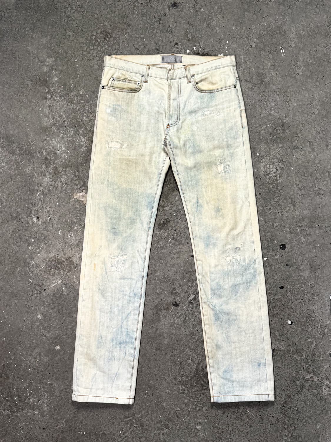 Dior Homme 2007ss – Cream Bleached Distressed Denim by Hedi Slimane 극도로 슬림한 실루엣과 락 무드를 기반으로 남성복의 패러다임을 바꾼 상징적인 디자이너의 Hedi Slimane의 2007년 Dior Homme 제품입니다. 아이스 진 베이스 위에 은은하게 블리치 워싱이 특징인 데님으로, 전체적으로 바랜 듯한 페이드와 데미지 위 누빔 가공이 매력적인 슬림 스트레이트 실루엣과 절제된 디스트로이드 디테일이 어우러진 제품입니다. (수선 이력 존재합니다.) 사이즈: 30 허리 32inch 밑위 24cm 허벅지 30cm 총기장 102cm 밑단: 19cm