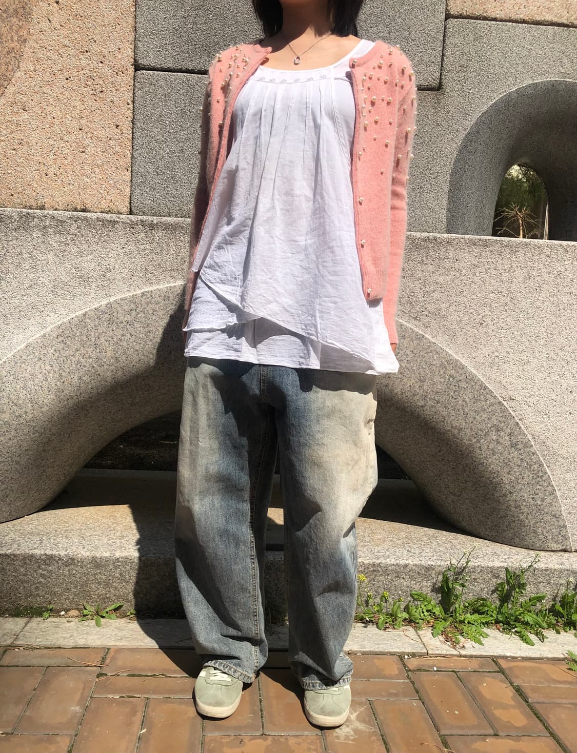 10% 할인 및 무료배송 이벤트 진행 중💗 한강 돗자리 깔고 인생샷 건지기 딱 좋은 봄 코디 🌸 얼굴 화사하게 밝혀주는 딸기우유 컬러감에 여리여리 핏까지 ..! 🍓🥛 데일리로 손 자주 갈, 지금 딱 입기 좋은 봄코디입니둥🫧 단위: cm (어깨/가슴/소매/총장) pink pearl cardigan (39/42/54/51) white layered sleeveless (32/41/74) wide washed pants L size(36/102) 세트 할인가 : 109.000 Contact DM