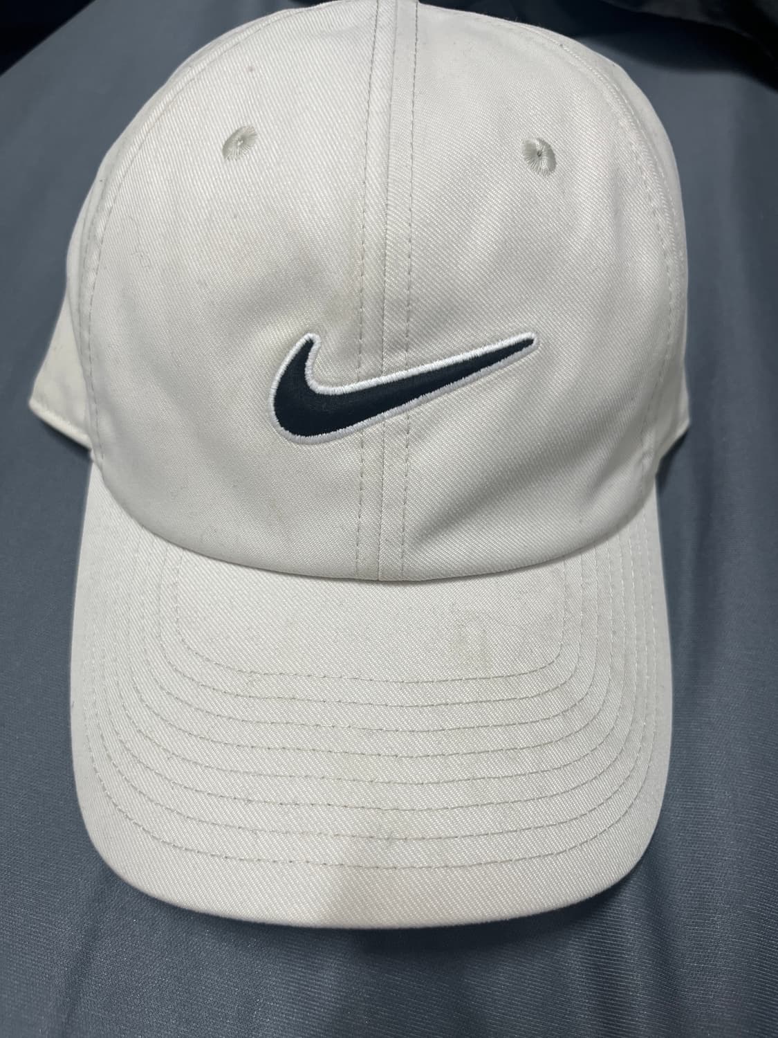 호불호 없는 차분한 베이지/아이보리 컬러에 전면의 시그니처 빅 스우시 자수가 확실한 존재감을 보여줍니다. 유행을 타지 않는 깔끔한 디자인으로 데일리로 활용하기 아주 좋은 아이템입니다. 전반적으로 깨끗하나, **내부 땀 밴드 부분에 미세한 황변(오염)**이 있습니다 (상세 사진 참고) (화장품) 이로 인해 가격을 낮춰 올립니다. 세탁하면 지워질 수도 있으나, 현재 상태 그대로 저렴하게 가져가실 분께 추천합니다 (문의는 편하게 메시지 주세요. 오염 감안하여 저렴하게 올립니다.) - 문의 3회 미만 쿨거 시 택포 - 교환/환불 불가