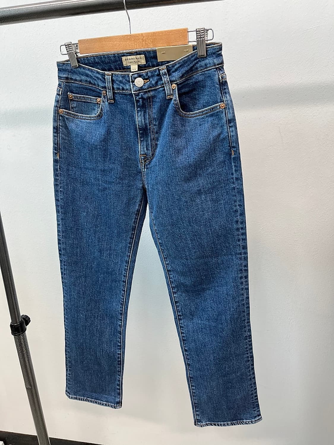 버버리 사이즈 26 권장 총장 91 허리단면 34 정품 버버리 자수 중청 크롭진 코튼 엘라혼방 디자인굿 미사용 새옷 저렴판매
