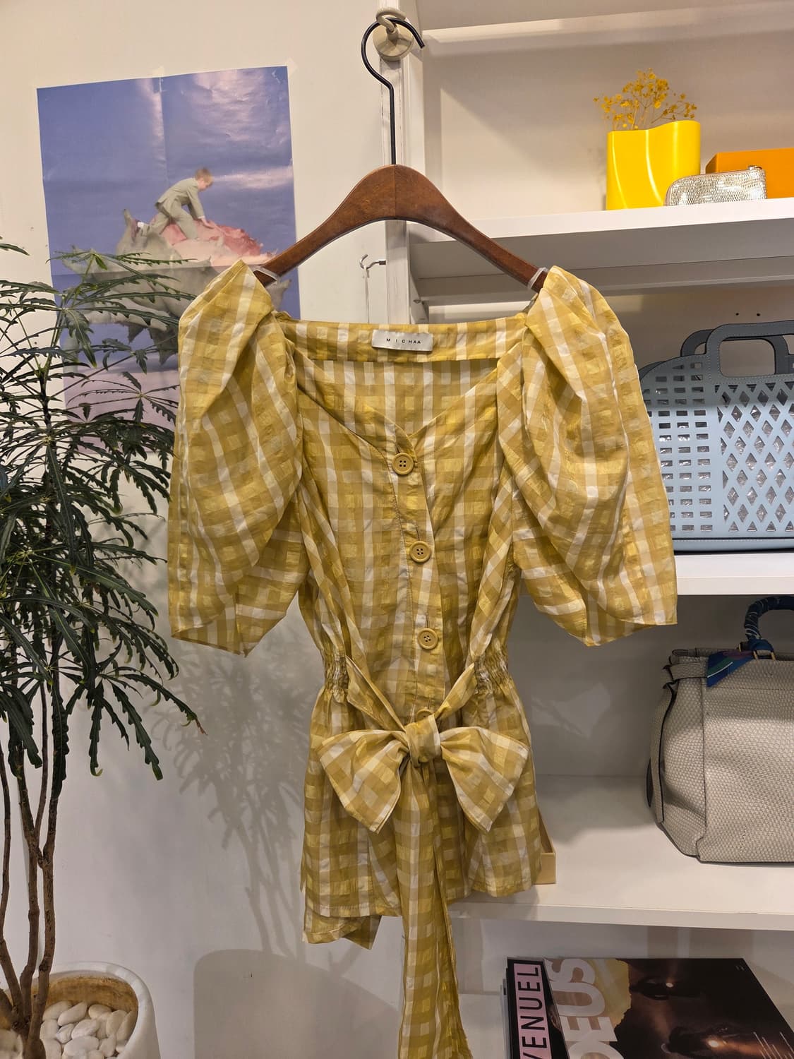-머스터드 옐로우 색상의 사랑스러운 체크 블라우스 -볼륨감있는 퍼프소매가 귀여우면서도 유니크해요. -허리 밴딩처리로 편하고 앞섶 사선언발 디자인으로 리본을 뒤로 묶어도 예뻐요. -어깨 안쪽 밴딩처리 -바스락한 느낌의 레이온 소재 -특별한 사용감이나 하자없이 아주 깨끗 -사이즈 S 가슴44 허리36 총장 짧은쪽60