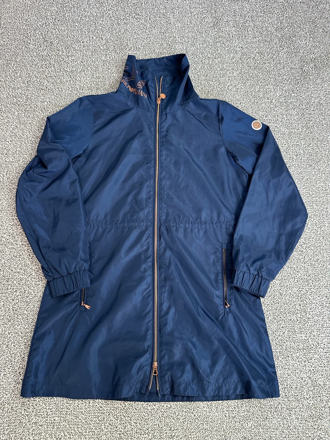 네이비 색상의 엠포리오 아르마니 바람막이 점퍼입니다. 가볍고 얇아서 간절기에 입기 좋을 것 같아요. 로고와 지퍼 디테일이 고급스러움을 더합니다. 별도 문의 없으시면 바로 안전결제 부탁드려요! * Size : 표기 ( 총장85 가슴55 어깨41 ) 9/10 Condition