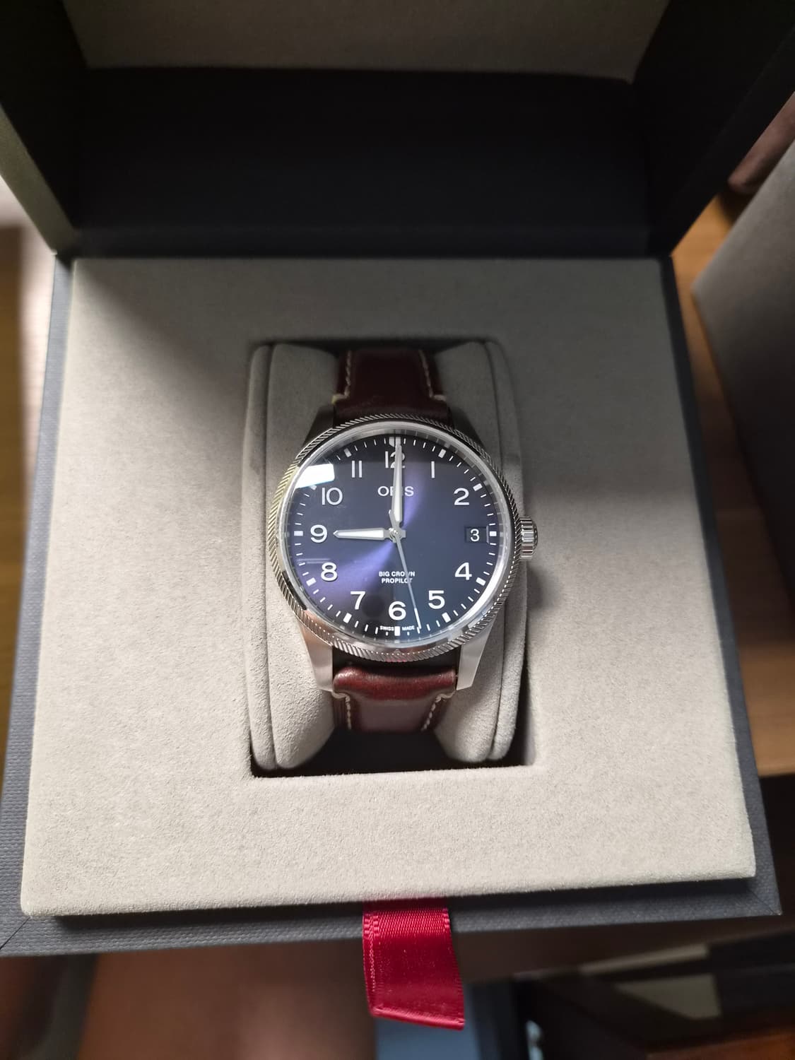 오리스 빅크라운 프로파일럿 가죽 시계 판매합니다. 풀박스 입니다 (태그 영수증 보증서 포함) 오버홀 X 폴리싱X 21년2월구매 생활기스 약하게 있는편입니다 흠이라면 박스가 살짝오염됬네요(사진참조)