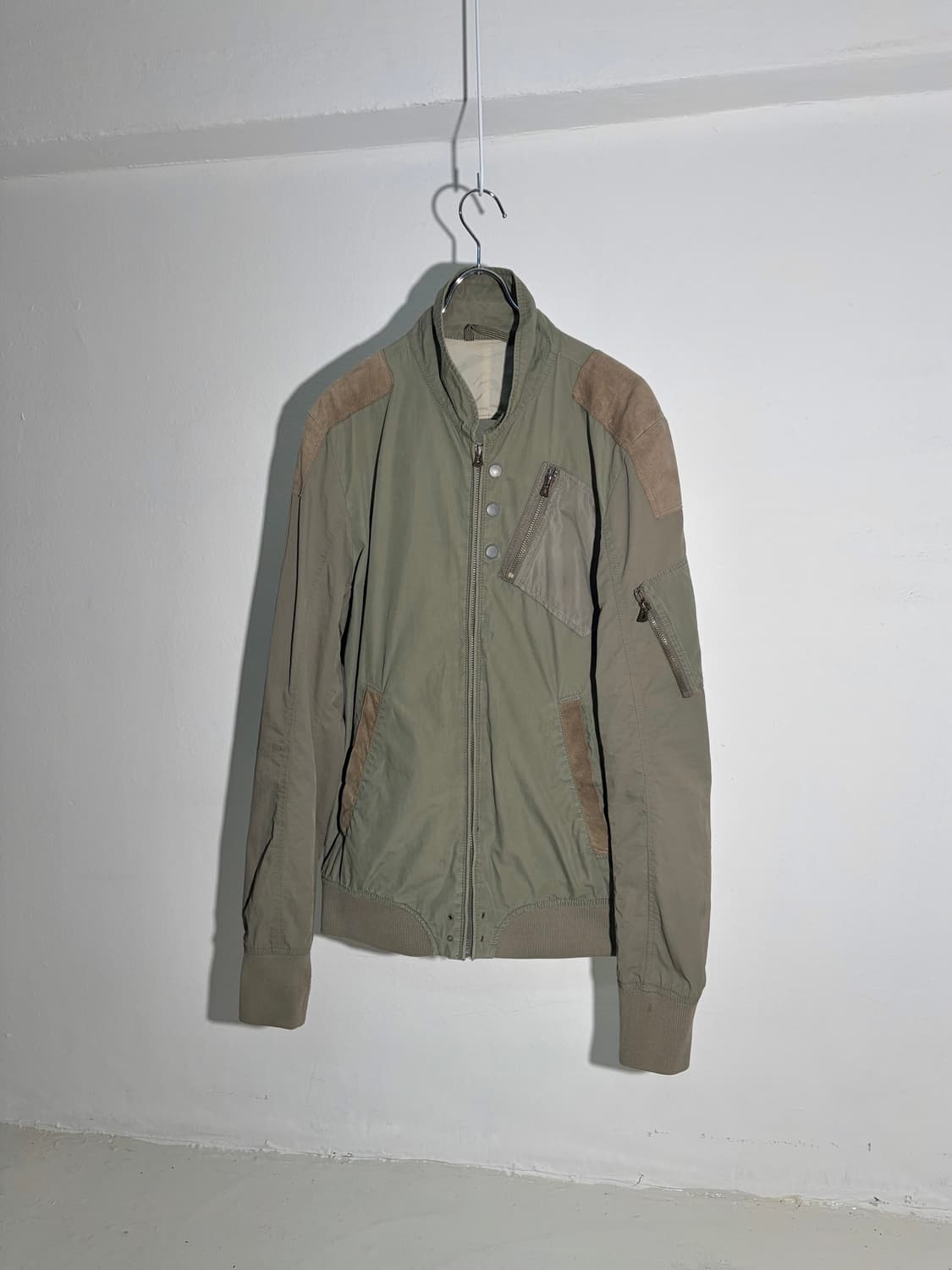 디젤의 나일론 블루종 자켓입니다 곳곳에 스웨이드 처리, 등판 구멍 등 변주가 많은 옷이에요 표기사이즈 M, 좋은 컨디션입니다 어깨 45 가슴 54 총장 70 팔 69