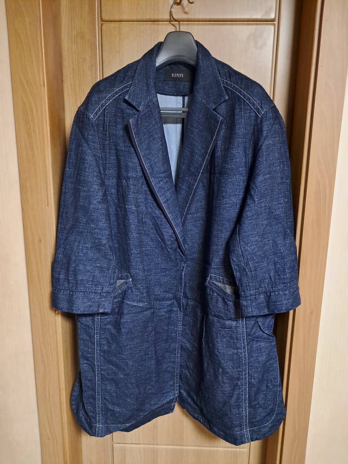 상태 깨끗합니다 간절기용 사이즈66 오버핏 (88-98-160) 가슴59 총장96 어깨52 팔46 면66 마34 도톰하고 부드러운 재질 똑딱단추 포켓2 네이비