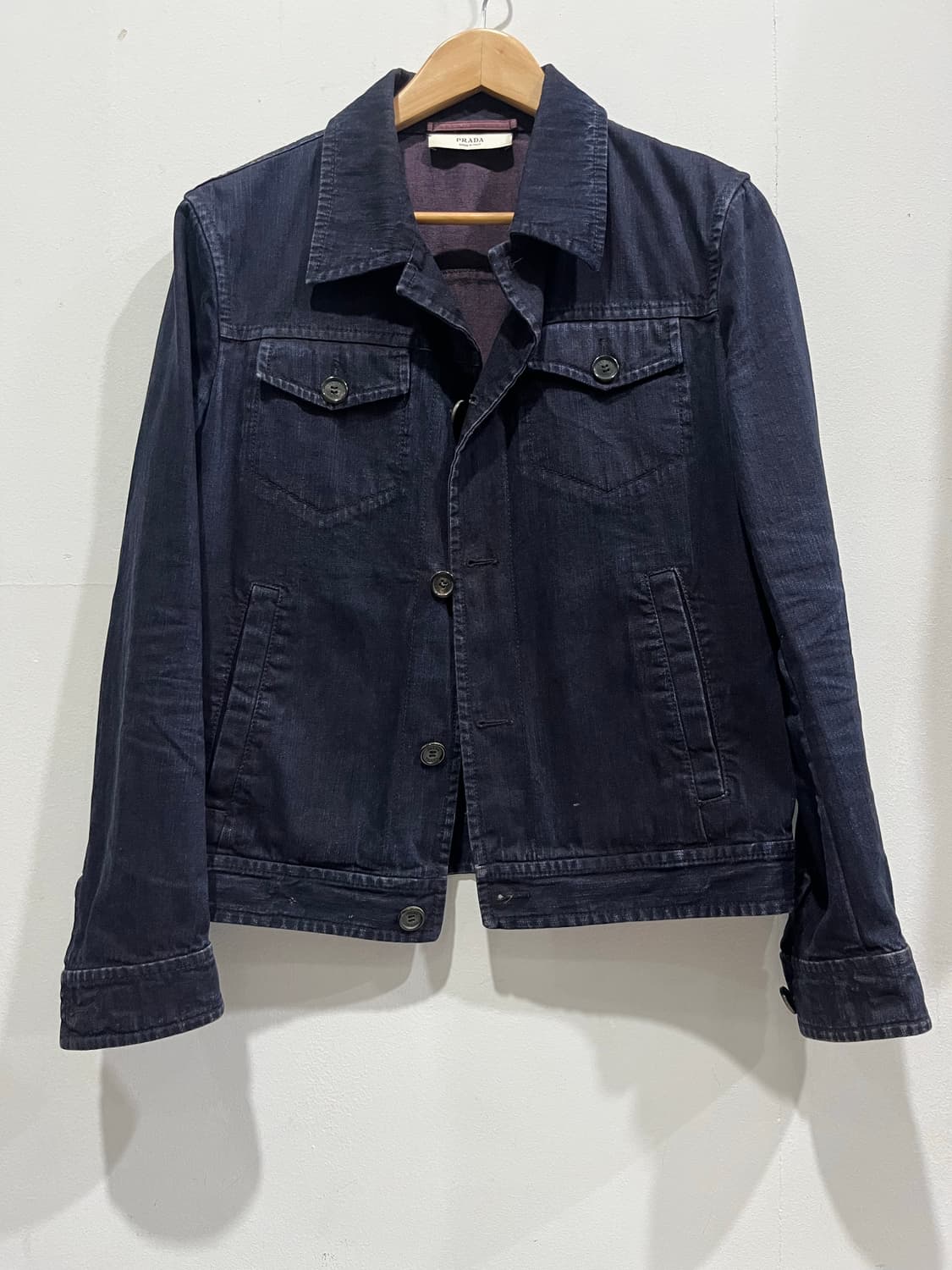 프라다 정품 데님 자켓이에요 사진에서 보이는 것처럼 깔끔한 디자인이 돋보여요 사이즈는 48이며, 남성분들이 입기 좋아요 어떤 옷에도 잘 어울리는 매력적인 아이템이랍니다