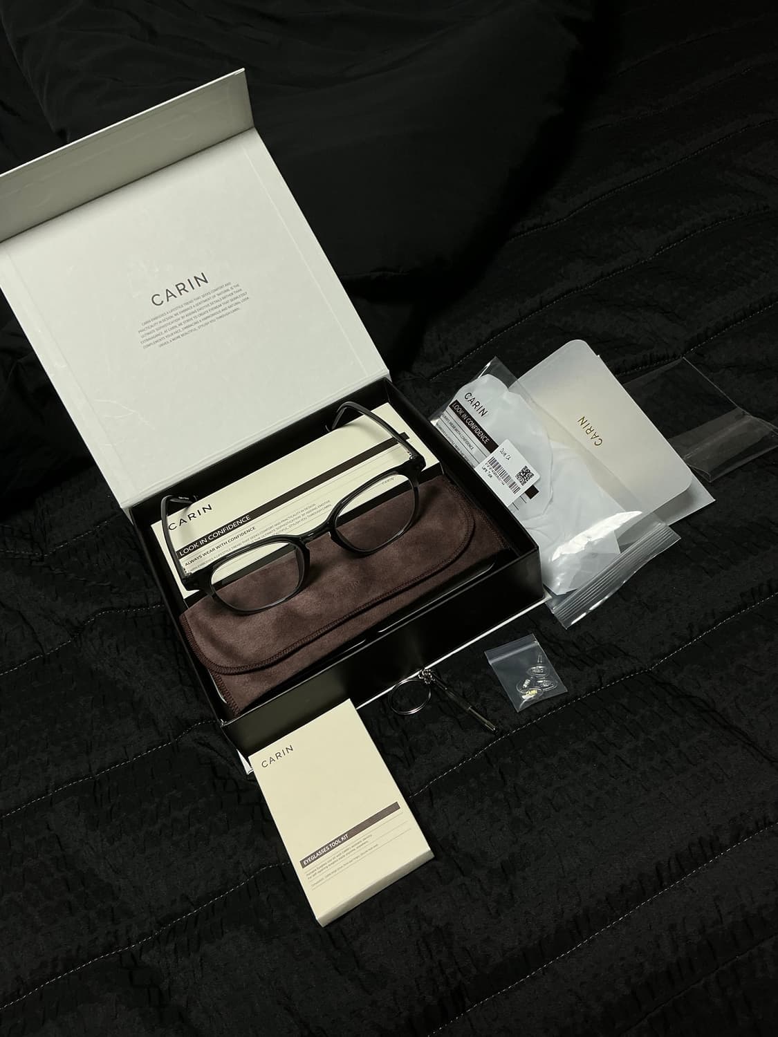 [제품명] : 카린 듀브 C4 안경 (CARIN) [상태] [ 10 / 10 ] 단 시간 착용 [구매 가격 ] : 140,000원 공홈 및 29CM 품절 제품입니다 용산에서 시착 후 예뻐서 구매 했지만 , 안경이 많아 처분합니다