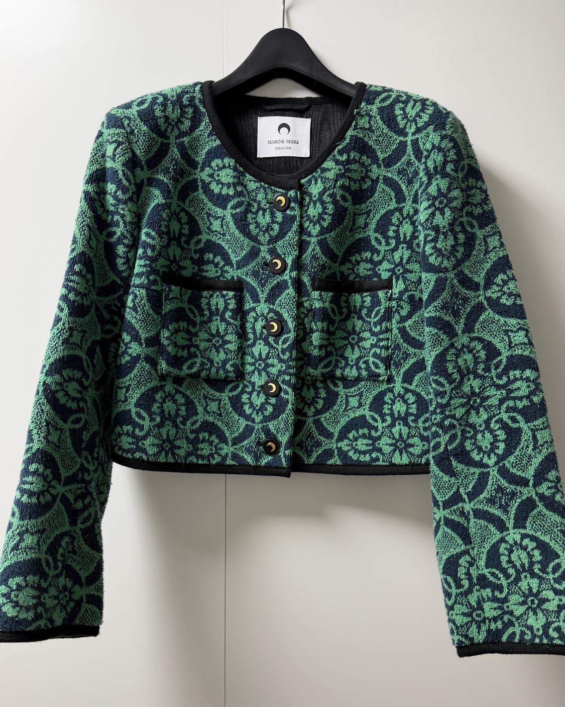 마린세르의 패턴 크롭 자켓이에요 자카드 패턴과 로고단추가 돋보이는 제품입니다 산뜻한 색감으로 포인트 주기 좋고 데님과도 잘어울려요 착용 3회미만이라 깨끗해요 다만 빈티지원단사용하여 제작하는 브랜드 특성+towel 패브릭인점 고려해주세요 (새상품자체가 필링 있는 제품) French 38로 55사이즈 분이 살짝 여유롭게 입을 수 있는 사이즈입니다