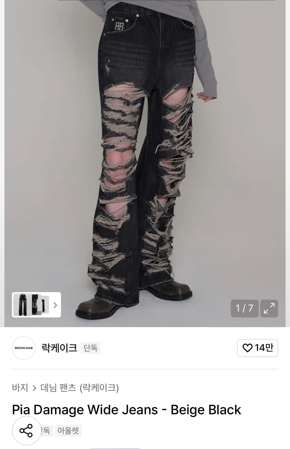 [새상품] 락케이크 피아 데미지 와이드 진 블랙 XS
