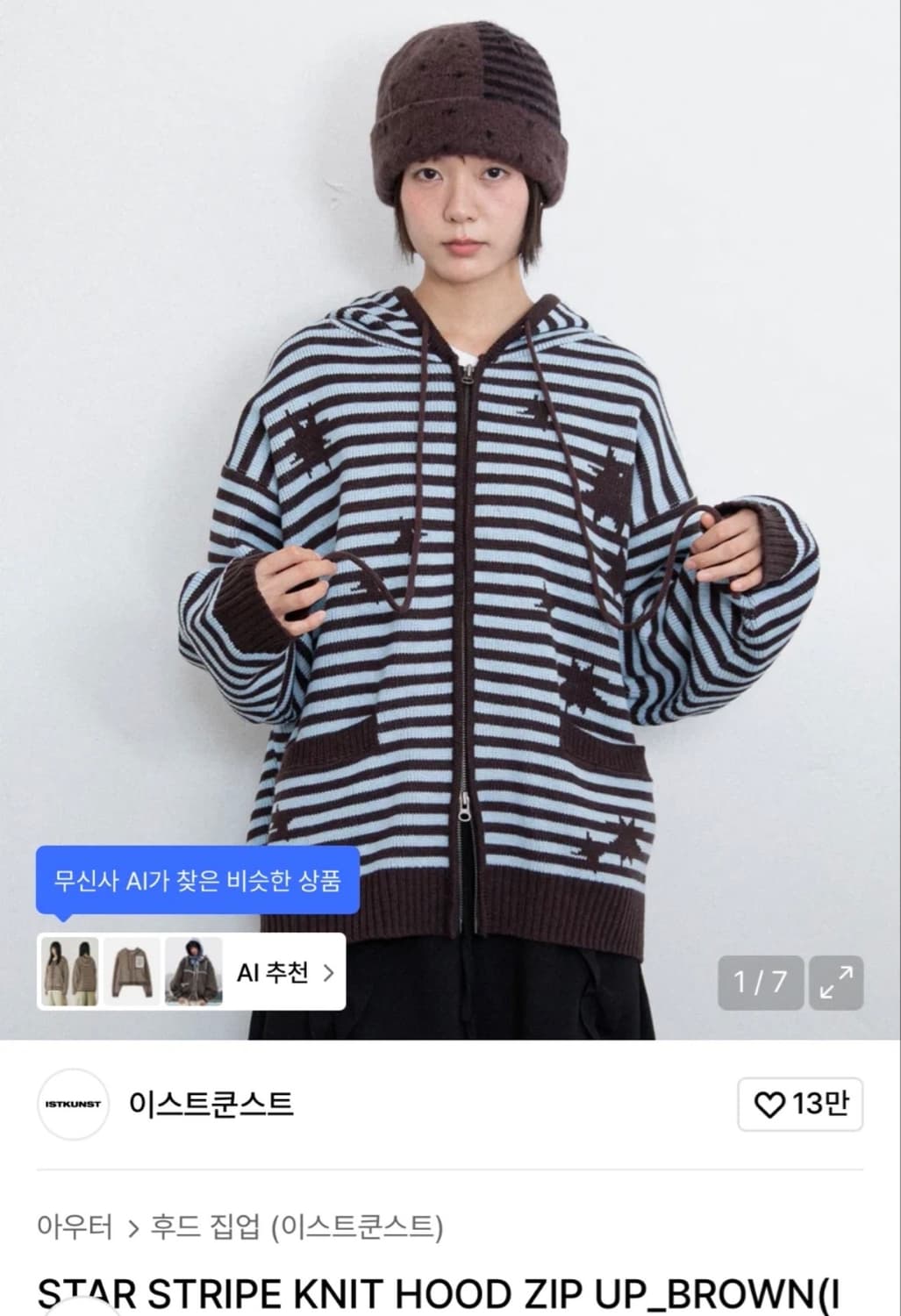 이스트쿤스트 스타 스트라이프 니트 후드 집업입니다 오버핏으로 편하게 입을 수 있어요 핏 예뻐요👉🏻👈🏻 저랑 브라운끼가 안 어울려서 팔아요 전체적으로 상태는 좋습니다 (실착 2회)