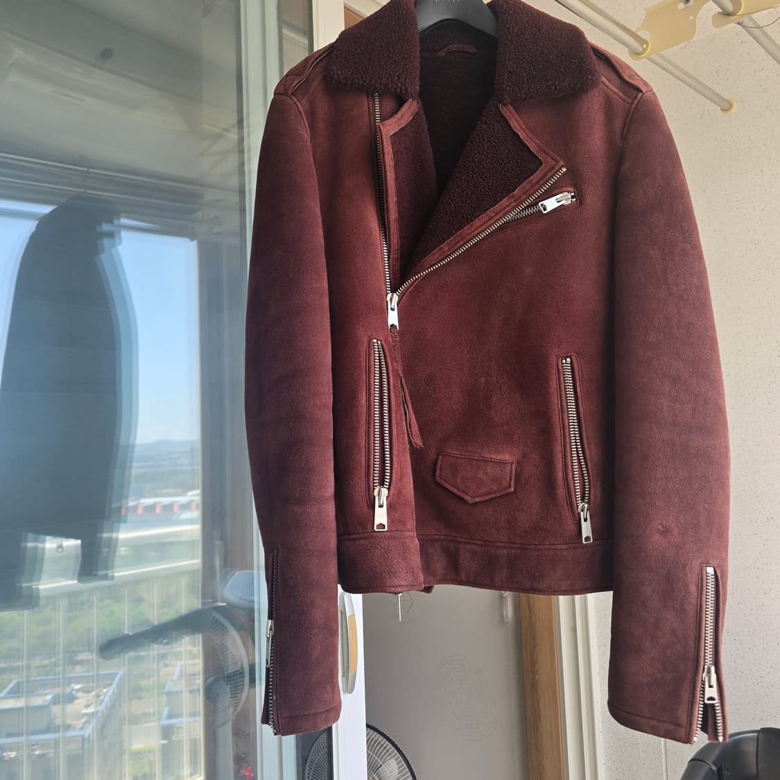 버건디 색상의 올세인츠 무스탕입니다. 사이즈는 미디움 입니다. 팔이 긴편이라 173 - 176 마른분에게 잘 어울릴거 같습니다. 소매의 오염 말고는 다른 오염은 없고 사용감 적은편 입니다.