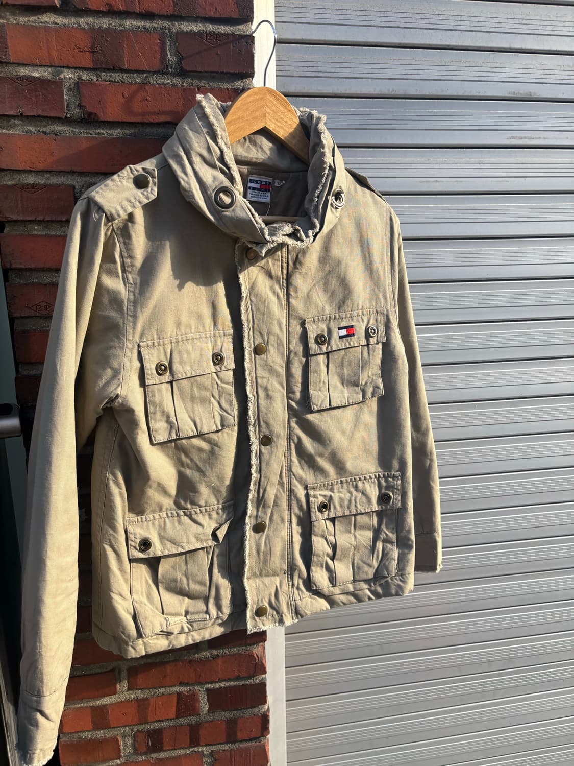가슴 50 총장 60 어깨 43 Tommy Hilfiger Made in USA 사파리 자켓입니다. 현재는 보기 드문 미국 생산 제품으로, 탄탄한 코튼 원단과 완성도 높은 디테일이 돋보이는 아이템입니다. 은은한 베이지 컬러에 자연스러운 사용감, 넥라인의 러프한 컷팅 디테일이 더해져 빈티지 특유의 분위기를 한층 더 살려줍니다. 프론트 4포켓 구조와 스냅 버튼 디테일로 실용성과 디자인을 모두 갖췄으며, 가볍게 걸치기 좋은 두께감으로 활용도가 높은 제품입니다. 티셔츠, 셔츠 위에 레이어드하여 아메리칸 캐주얼, 워크웨어, 밀리터리 무드까지 다양하게 연출 가능한 아이템입니다. 현재는 쉽게 구하기 어려운 Made in USA 생산의 빈티지 힐피거 제품으로 소장 가치 있는 한 점입니다.