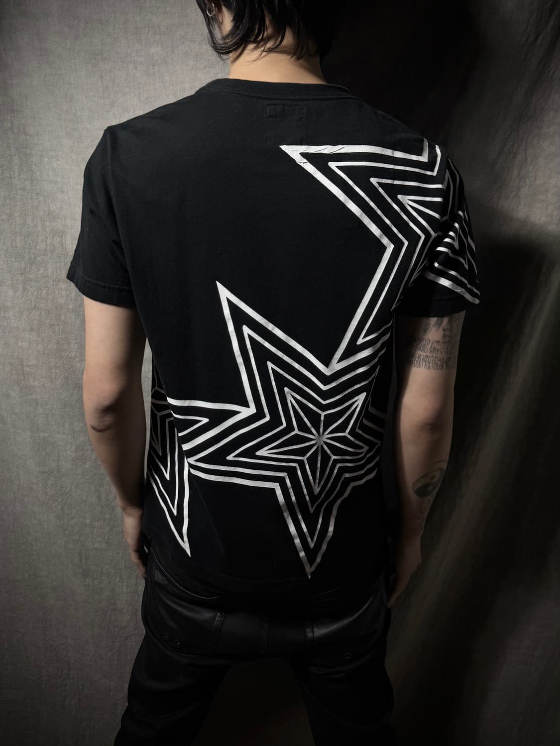 코디샌더슨 멀티 스타 프린팅 티셔츠 전면의 시그니처 화살표 로고와 후면의 스타 프린팅이 대조를 이루는 피스입니다. 인디언 주얼리 모티프를 그래픽으로 재해석하여 강렬한 인상을 줍니다. 탄탄한 코튼 소재로 제작되어 실루엣 유지력이 뛰어나며 브랜드의 상징적인 디자인 요소를 담고 있습니다. Condition: B (후면 프린팅 갈라짐 존재) Size: M Shoulder/Chest/Sleeve/Length: 44/48/20/68cm Fabric: Cotton 100%
