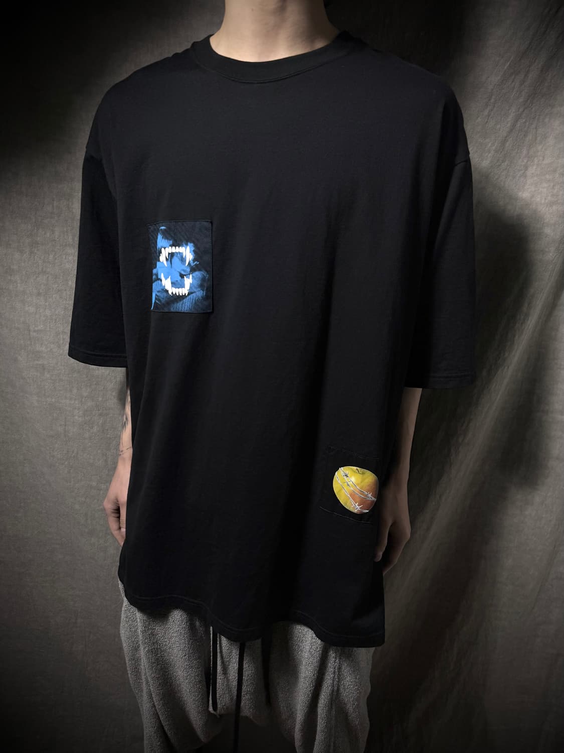 언더커버 멀티 그래픽 패치 반팔 티셔츠 2021SS 시즌 모델로 전면 상단의 블루 패치와 하단의 사과 그래픽 그리고 후면의 레드 텍스트 패치가 조합된 제품입니다. 브랜드의 상징적인 그래픽 요소들이 불규칙하게 배치되어 입체적인 시각 효과를 줍니다. Condition: A Size: 5 Shoulder: 57/Chest: 67/Sleeve: 31/Length:78(cm) Fabric: Cotton 100%