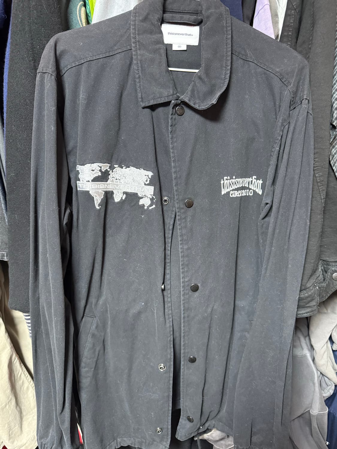 디스이즈네버댓의 코치 자켓이에요 사진에서 보이는 것처럼 M 사이즈이고 블랙 색상이에요 깔끔한 디자인으로 어디에나 매치하기 좋아요 데일리룩으로 활용하기 좋은 자켓이랍니다