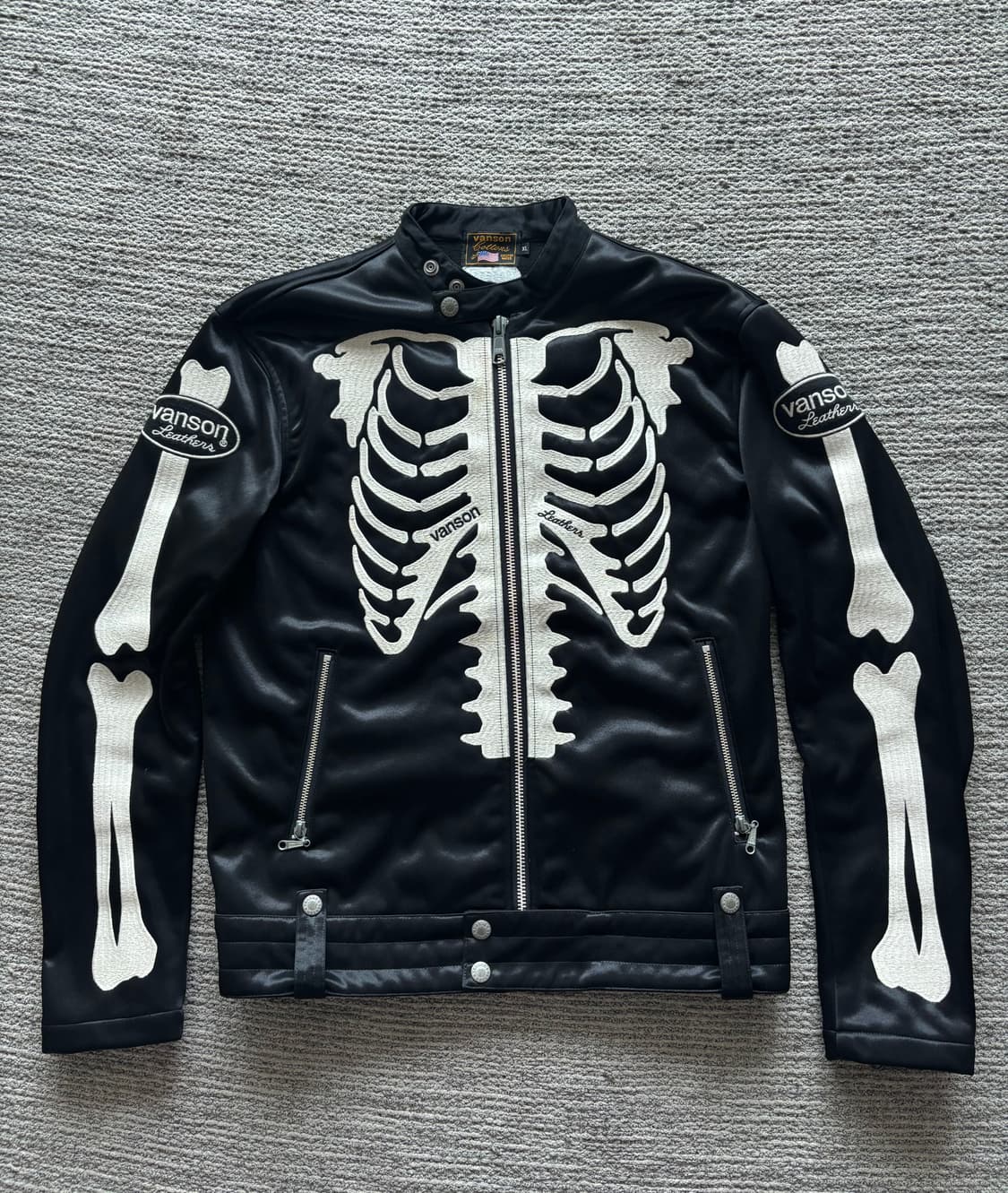 밴슨 본 라이더 자켓 XL 사이즈 판매합니다. AAO에서 구매한 제품으로, 착용 횟수가 많지 않아 전반적으로 상태 매우 좋으며 하자 없습니다. XL 표기이지만, 실측 기준으로 평소 L 사이즈 착용하시는 분들께 잘 맞는 핏입니다. * 어깨: 50cm * 가슴: 56cm * 소매: 67cm * 총장: 64cm