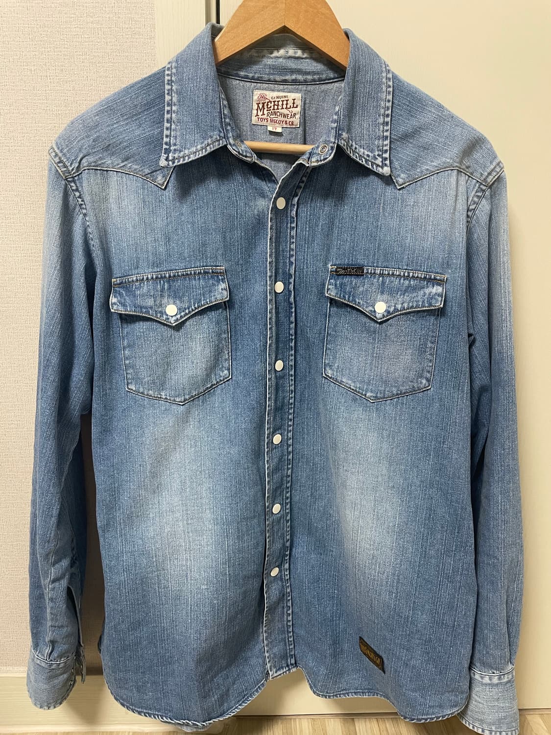 영화 '네바다 스미스(1966)' 속 스티브 맥퀸 착장입니다. • 5버튼 커프스 (5-button cuffs) • 특징적인 백 요크 (Back Yoke) • 에이징처리로 인디고 본연의 블루 톤을 유지하면서도 실제 입어서 바랜 듯한 리얼한 페이드감이 특징 사이즈 17입니다.