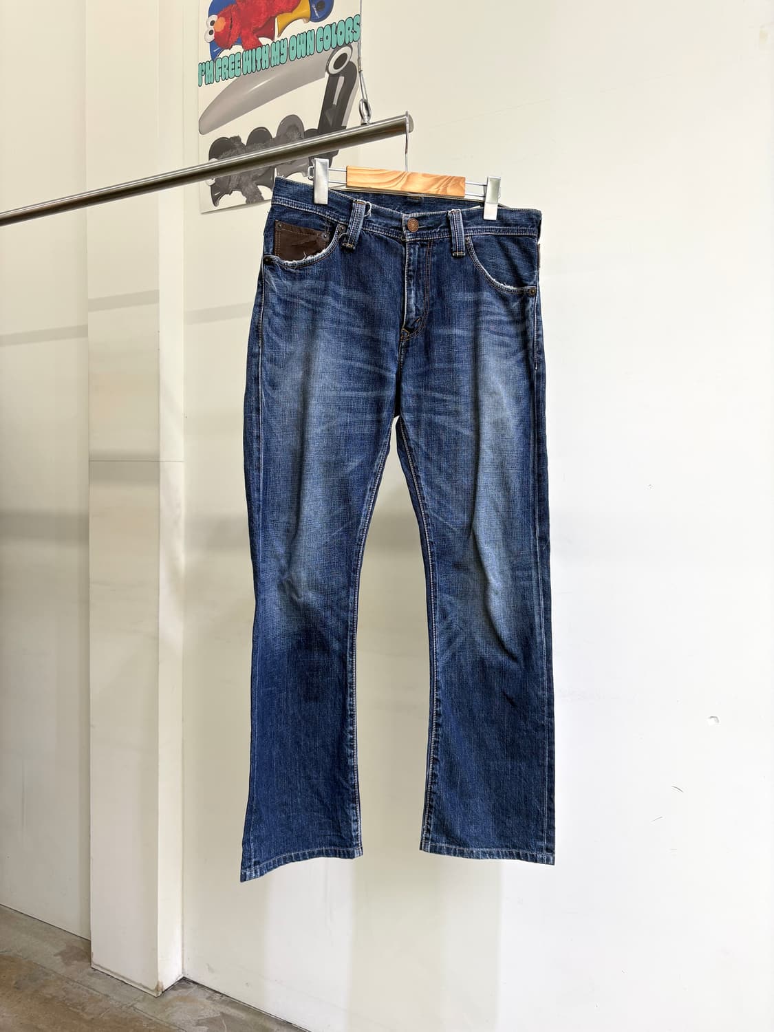 세컨핸즈 상품 상품 컨디션 : B 소재 : 면 100% 표기 사이즈 32 사이즈 실측 (단위 : cm 단면 기준) 허리 40 / 밑위 29 / 허벅지 31 / 밑단 22 / 총장 101