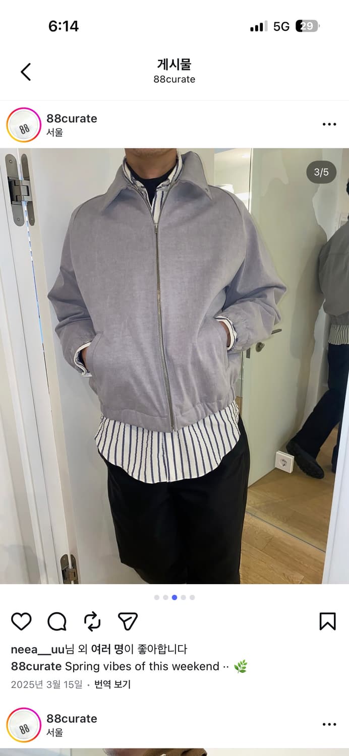 라지 사이즈입니다. 총장은 63 정도로 숏하게 입기 좋은 자켓입니다. 오묘한 그레이 빛이 감도는 탄탄한 저지 자켓입니다. 문의 주세요!