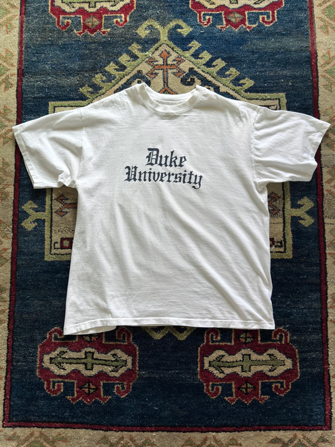1838년 미국 노스캐롤라이나주 더럼에 설립되어 아이비리그급으로 평가되는 미국 상위권 명문 사립대학 “Duke University”의 90년대 미국생산 디플로마체 폰트 티셔츠입니다 전면부 프린팅엔 크롬하츠에서 쓰이는 글씨체인 “디플로마체”로 Duke University의 프린팅 폰트가 근사하며 고급스럽습니다 밑단,소매 싱글스티치 (수소봉제) , 옆구리 봉제선이 없는 튜블러로 착용시 입체적인 미국핏이 참 멋집니다 ( 6,7번 사진 ) 30년이 넘었고 화이트바디임에도 불구하고 순백의 화이트바디를 유지중입니다 새것의 매우 좋은 데드스탁 컨디션이며 * 실측 사이즈는 XL (103) 착용감입니다 * 실측 비례또한 총장은 크롭하여 다리는 더 길어보이며 품은 여유로운느낌이 참 좋아요 미국 노스캐롤라이나주 더럼의 역사깊은 명문대학 “Duke University”의 90년대 오리지널 미국생산 디플로마체 폰트 티셔츠를 취향껏 즐겨주세요 = ) ( 총장 : 63 어깨 : 53 가슴 : 58 팔 길이 : 21 )