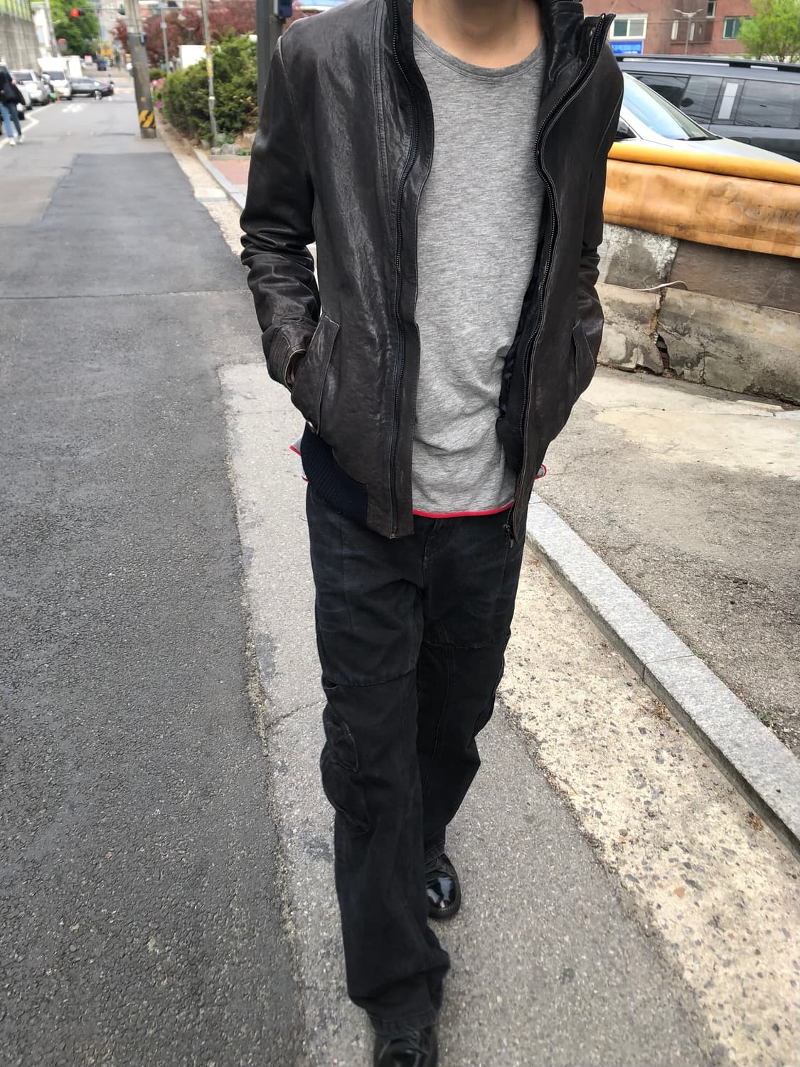 𝗪𝗢𝗢𝗬𝗢𝗨𝗡𝗚𝗠𝗜 High Neck Sheep Skin Leather Jacket [Dark Brown] Size : 38 Condition : 7 / 10 Shoulder : 46 Chest : 50 Sleeve : 65 Length : 67 Hem : 43 Model : 178 / 66 * 에이징 존재