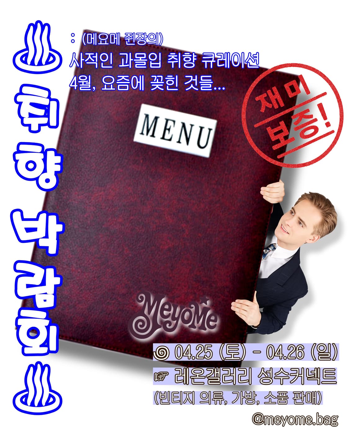 🎫 입장권 구매해야합니다! 젤리버킨 등 이것저것 들고갑니다. 프리뷰는 인스타 공지예정 ⭐️ 🐾 2026.04.25(토)-04.26(일) 서울 성동구 아차산로1가길 11, 지하1층 <뚝섬역 도보 3분 거리> (토): 1:00-7:00, (일): 1:00-6:00 🐾입장권 구매는 @moreamy.market 프로필 상단 윗치폼 접속! (04.01 12:00 오픈, 04.24 11:59 마감) 🐾참가 셀러 달다구리의 보물함 (@daldaguriyum ) 핑크맨션 (@pinkmansion__ ) 낡은상자 (@old__box_ ) 파랑새 상점 (@b.lue_b.ird ) 소화 잡화점 (@sohwa_v__v ) 프링베리 (@pring_berry ) 메요메 (@meyome.bag ) 코코로야 (@_kokoroya_ ) 자세한 안내사항은 @moreamy.market 계정 팔로우 후, 봐주세요💌
