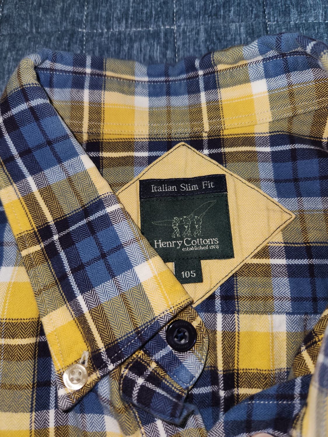 헨리코튼 사의 코튼 체크셔츠입니다 근접 샷 보시면 아시겠지만 좋은 원단 쓴 셔츠입니다 italian slim fit이라 표기상 105지만 100 사이즈 입으시는 분께 추천 드립니다 실물 색감은 첫번째 사진과 가장 유사합니다~
