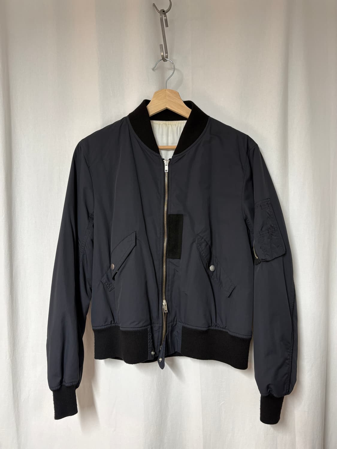 'The Letters' 14fw MA-1 Bomber Jacket 더 레터스 14fw MA-1 봄버 자켓 + 색상 블랙 + 사이즈 M + 실측 어깨45x가슴56x팔기장65x총기장60 + 나일론100/안감 모달100/시보리 울100 + 프론트 사슴가죽(Deerskin) 패치 + RACCAGNI(Italy) 2웨이 퍼스너 + 2아웃 플랩포켓 + 2이너 포켓/1슬리브 지퍼포켓 + 리테일 72,000엔 + Made in Japan 현행에선 보기힘든 크롭한 기장감/ 부드러운 소재감, 안감변색, 시보리 핀홀등 사용감 있지만 좋은 무드