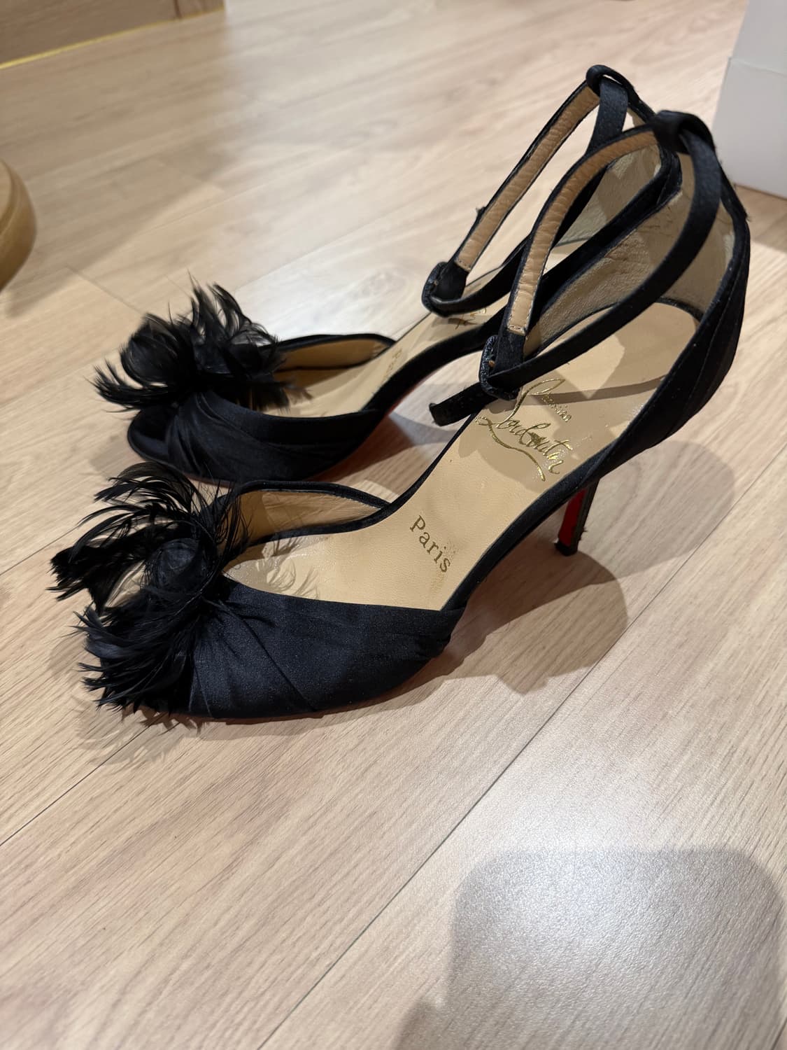크리스찬루부탱 새틴 힐 새틴재질로 굉장히 고급스럽고 정가 200넘어요 사이즈 36.5 깃털같은거 달려있고 많이는 신지못했어요 제가 키가 커서 안보이는 사용감 살짝 있을수 있습니다