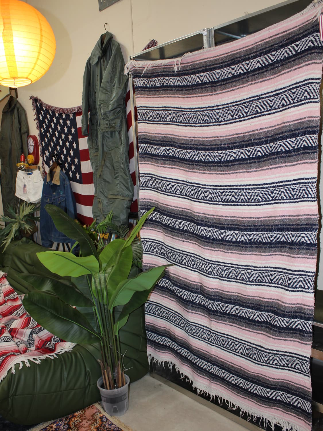 90년대 멕시코에서 생산된 전형적인 다이아몬드 & 스트라이프 패턴의 세라페 블랭킷입니다. 탄탄하고 조밀한 기계식 직조감이 특징이며, 90년대 북미 시장에서 인기를 끌던 선명한 핑크 컬러가 돋보입니다 피부에 닿는 질감이 부드러워 실제 침대나 소파 커버로 활용하기 좋으며, 공간의 분위기를 만들어주는 오브제로 강력 추천합니다 침대아래,쇼파위,벽면 툭 걸쳐놔도 좋고 각잡고 깔아놔도 좋습니다. 사이즈-(cm) 176x110