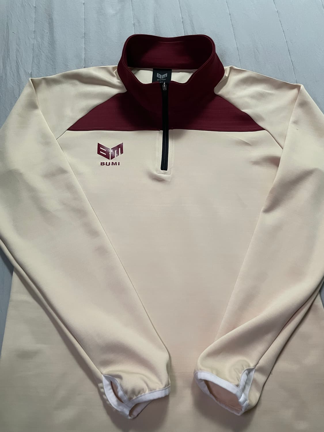 아이보리색에 버건디색의 트레이닝복입니다 핑커홀있습니다 90사이즈입니다