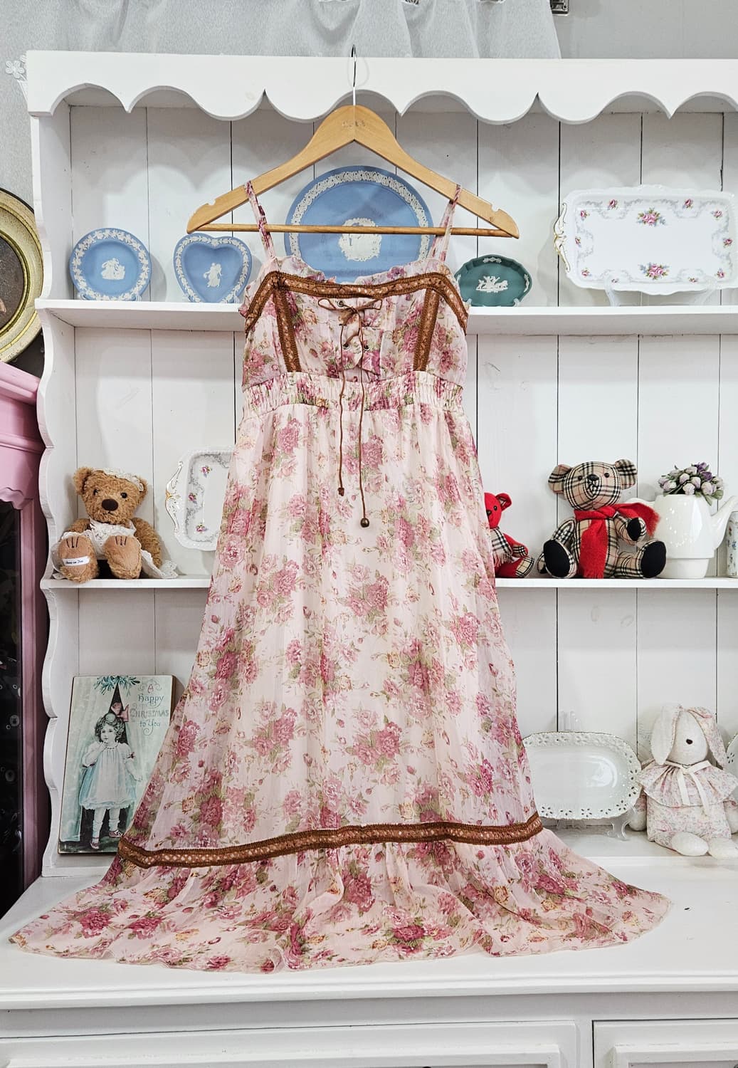 escape 플라워 쉬폰 롱원피스 딸기우유빛 핑크 로즈 패턴에 브라운 레이스 + 코르셋 끈 디테일로 러블리한 히메갸루 무드 제대로 살아있는 원피스 가슴 셔링이라 착용감 편하고 핏 자연스럽게 떨어져서 실루엣 예쁜 제품 가슴 42 기장 106 소재: 폴리 100% (쉬폰)
