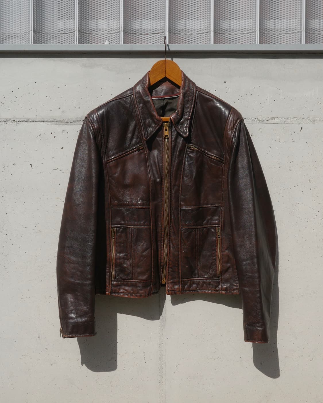 Detail 1970's Lesco Leather Sports Motorcycle Jacket Size (cm) 어깨48 가슴57 총장64 소매64 Material : Leather ✑ 1970's ✑ Lesco Leather ✑ 당시 특유의 비닐 같은 원단 느낌이 아닌 두께감 있는 원단 ✑ 후면 스포츠 자켓 디테일 BI Swing Back ✑ Talon Zipper ✑ 라이닝 x