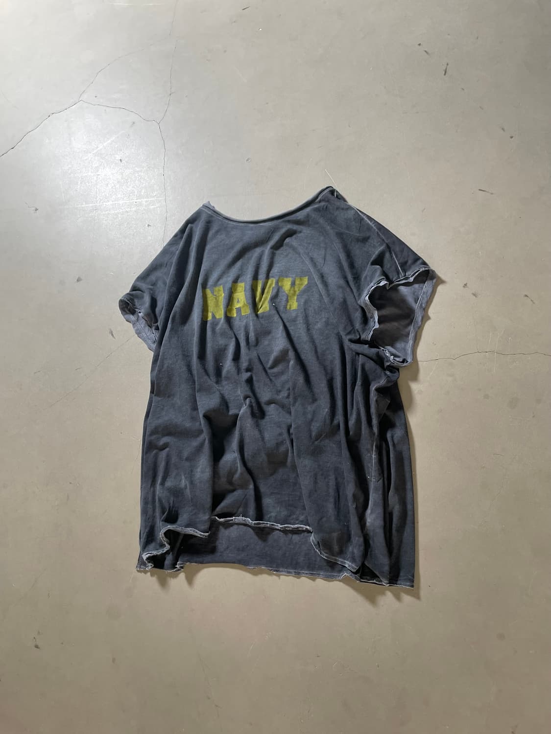 Product Info • Brand : KZ Atelier • Item : NAVY Tee • Color : Charcoal • Size : OS • Measurements : 품 71cm / 총장 74cm • Fabric : Cotton • Condition : 자연스러운 페이딩 및 데미지 ⸻ Description KZ 아틀리에에서 제작한 커스텀 빈티지 티셔츠입니다. 네이비 프린팅과 자연스러운 페이딩, 컷오프 디테일이 특징이며 루즈한 실루엣으로 편안하게 착용 가능한 제품입니다