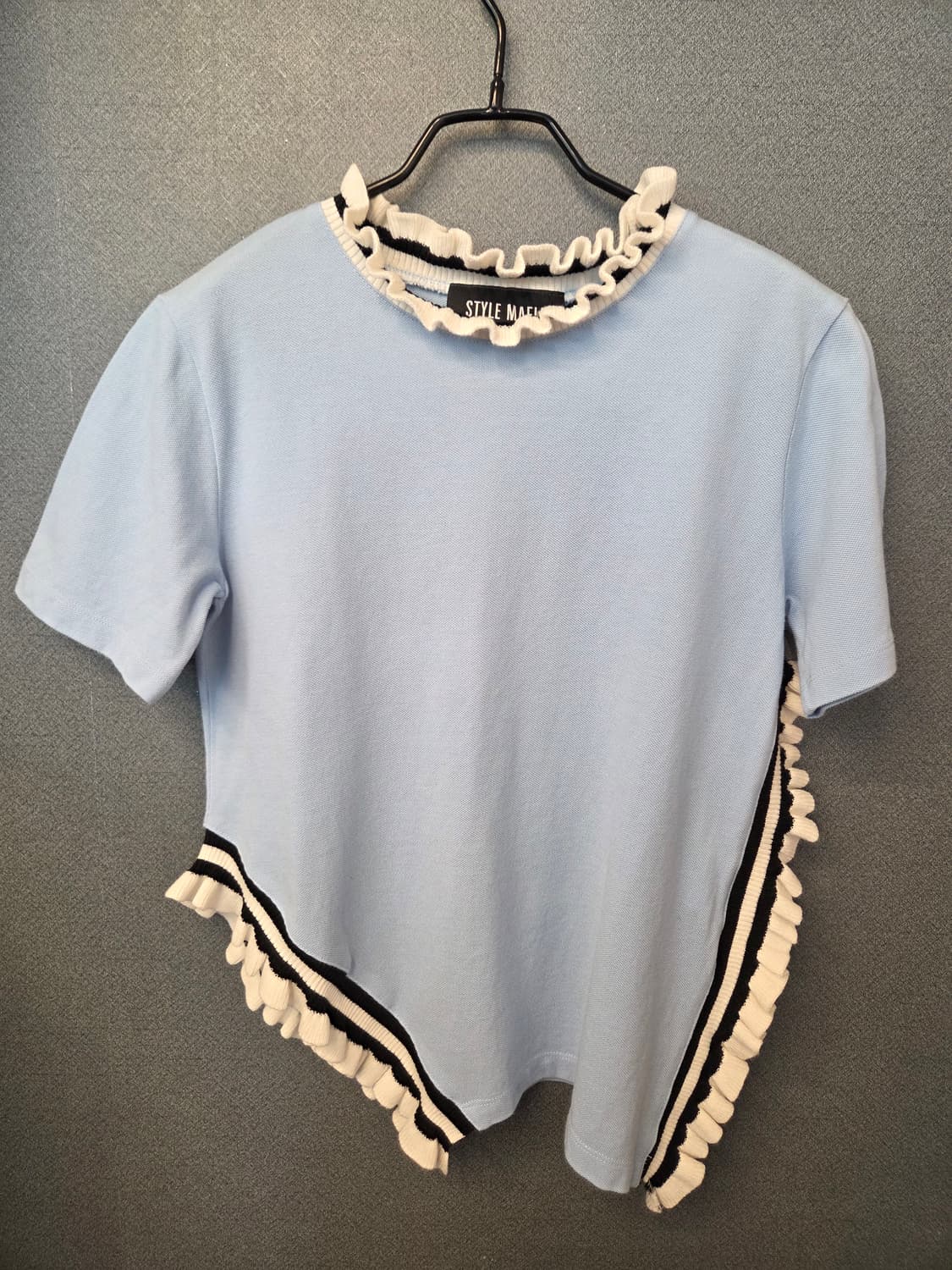 스타일 마피아 언발란스 반팔티에요. 사이즈 s, 가슴단면 43, 총장 50-60, 44-55까지 맞으실것같아요. 색상 하늘색에 검정,흰색의 배색이 포인트되어있어요. 언발란스 대칭이 유니크해요. 사용감 많지않아요.