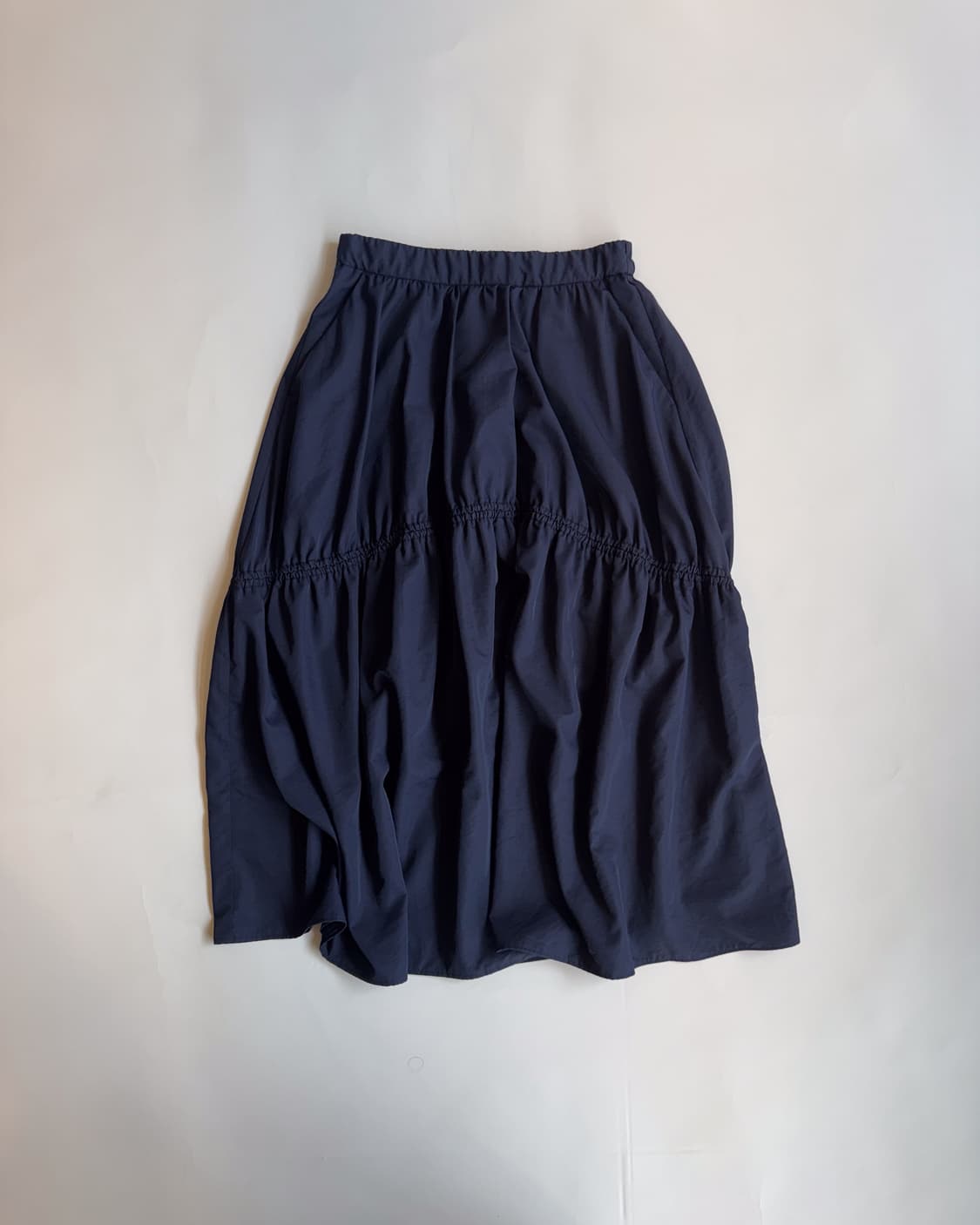 풍성한 셔링 디테일이 돋보이는 네이비 컬러의 티어드 스커트입니다. 가벼운 소재감으로 제작되어 활동성이 좋으며 유니크한 실루엣을 자랑합니다. Condition : A 밴딩 허리 29-41