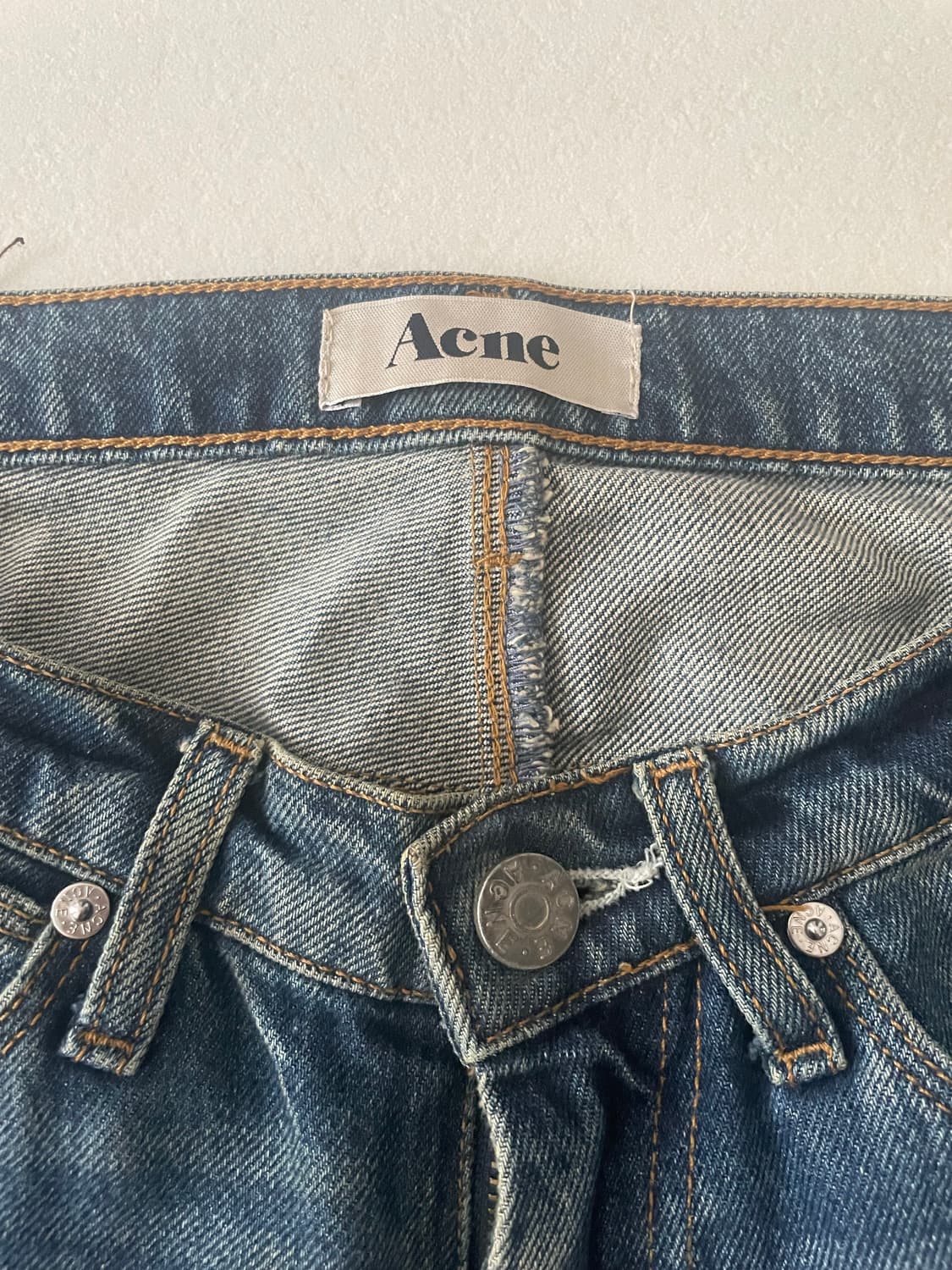 아크네 데님 사용감 많아요! 군데군데 이염 있어요 데님이라 티는 안나고 묻히지만 이염있음 허리 40.5cm 총장 96.5cm