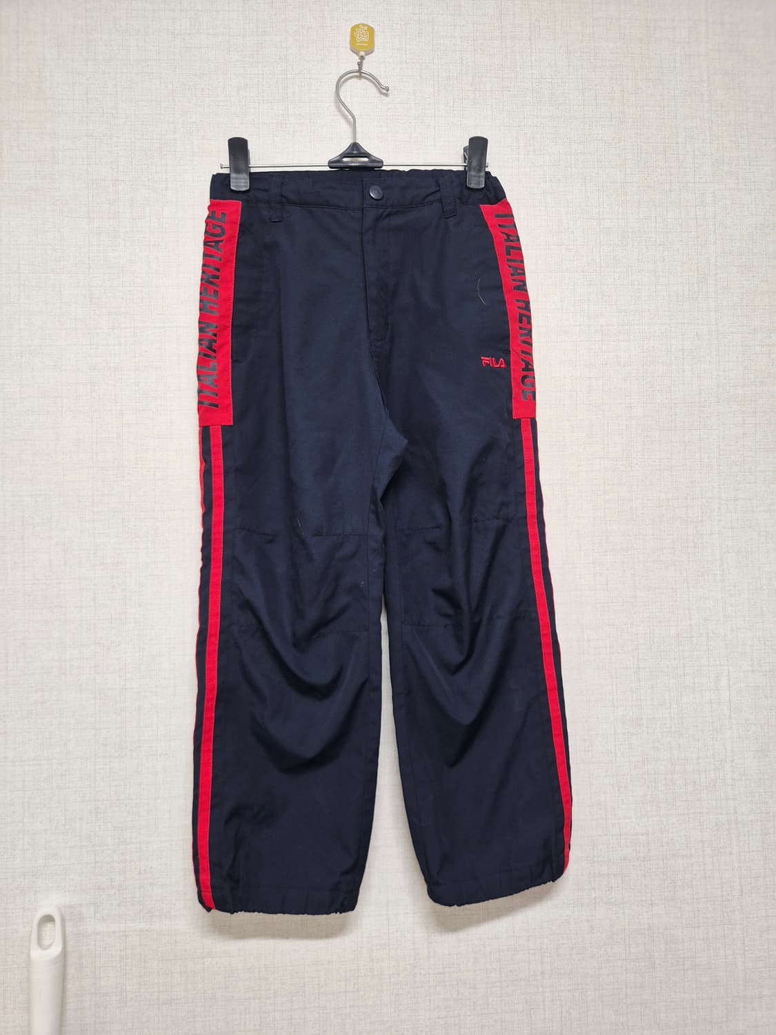 휠라의 네이비 색상 트레이닝 바지에요 빨간색 라인 포인트가 멋스러워요 활동하기 편해서 데일리로 입기 좋아요 편안하면서도 스타일리시한 코디로 좋아요 L사이즈 정도 됩니다 반값&일반택배 선택가능 다른제품과 같이구매시 할인 들어갑니다