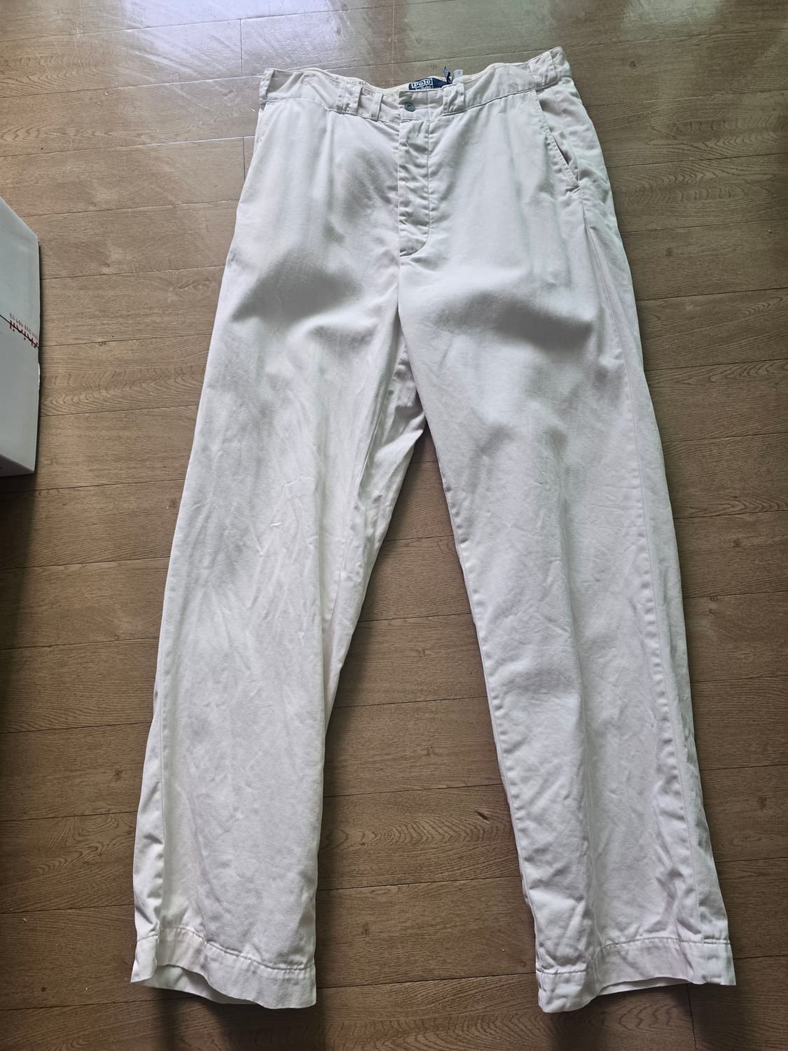 폴로 빅치노입니다. 해군느낌의 치노팬츠이며, 아이보리색상입니다. 사이즈는 34x34입니다. 기장 미수선상태 실측은 세탁 후 실측 허리 46 기장 118 밑단 26.5 허벅지 37.5 인심 82