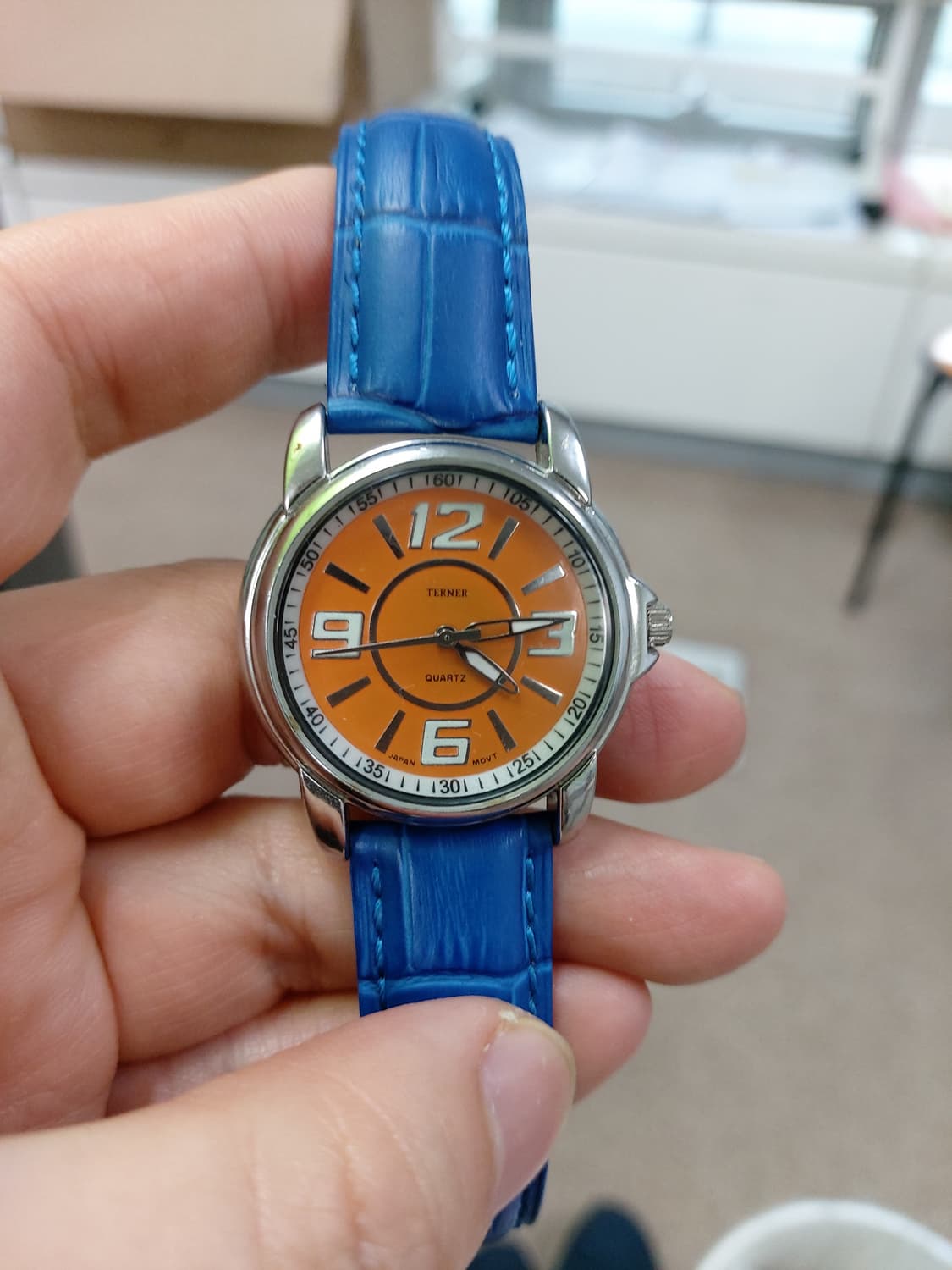 테르너 남성 가죽 시계 판매합니다. 오렌지색 다이얼이 포인트로, 시원한 블루 가죽 밴드와 매치됩니다. 평소 캐주얼하게 착용하기 좋은 시계입니다. 별도 문의 없으시면 바로 안전결제 부탁드려요!