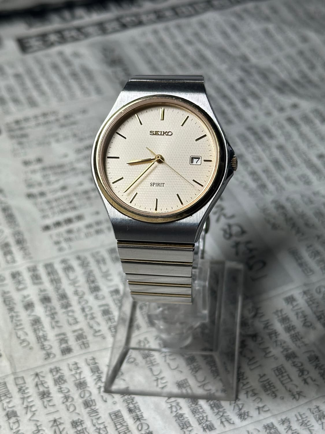 SEIKO • 세이코 스피릿 • 쿼츠 • 32mm Seiko Spirit 라인의 심플하면서도 견고한 데일리 빈티지 시계입니다. 고급스럽게 빛나는 골드 빛 텍스처 다이얼이 매력적이며 전반적으로 깔끔한 미니멀 디자인이 특징인 제품 입니다. 골드 인덱스와 스트랩에 실버와 골드 빛이 절묘하게 섞여서 더 고급스러운 느낌을 연출하는 제품 입니다. #빈티지#세이코#빈티지시계#빈티지세이코#쿼츠#세이코#손목시계#스피릿