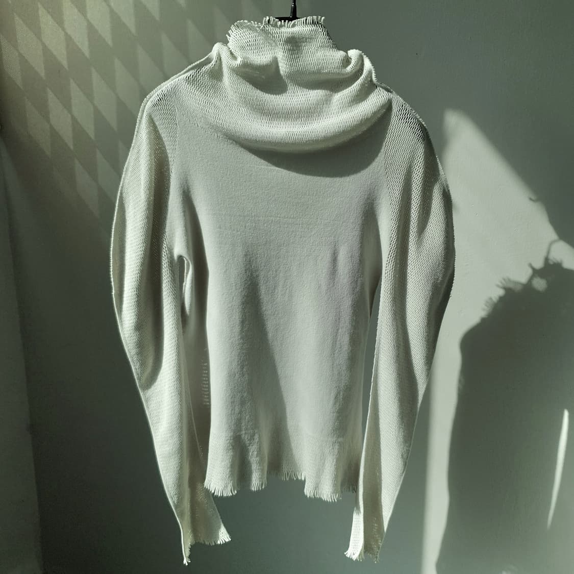 (사진의 붉은색은 빛 반사입니다) 레전드 디자이너 이세이 미야케의 시그니처인 플리츠 가공을 일상에서 다채롭고 화려하게 즐길 수 있는 라인, FÊTE(축제) 라인의 카울넥 니트 탑, 롱슬리브, 긴팔 티셔츠입니다 소재는 나일론, 폴리 혼방으로 가볍고 뛰어난 신축성을 띄구요 착용 시 압박 없이 체형에 맞춰주네요 컬러는 그레이가 섞인 아이보리로 연한 그레이 혹은 푸른빛이 도는 아이보리 컬러의 오묘한 색감입니다 만듦새는 이세이 미야케의 혁신적인 기술력, A-POC(a piece of cloth, 무봉제 컴퓨터 편직기술)이구요 그로인해 원단 로스율이 거의 없는 친환경 공정으로 봉제선 없는 매끄럽고 편안한 착용감, 인체공학적인 실루엣과 입체적인 텍스처를 자랑합니다 디자인은 바디를 제외한 넥, 소매, 밑단은 메쉬(시스루) 형태로 끝단은 모두 컷 오프 형태구요 넥은 자연스러운 드레이프가 생기는 카울 넥 타입으로 조임 없이 여유 있는 형태에요 상당히 미래 지향적인 디자인에 유니크하고 우하한 분위기입니다 08A/W 제품이구요 약한 사용감 외에 데미지, 오염 없는 좋은 컨디션으로 여성 ~ L(마른)까지 추천드립니다 (신축성이 좋습니다) 10중 8~9정도, 표기사이즈 2 어깨포함팔길이70 가슴34 총길이57,67(넥포함)